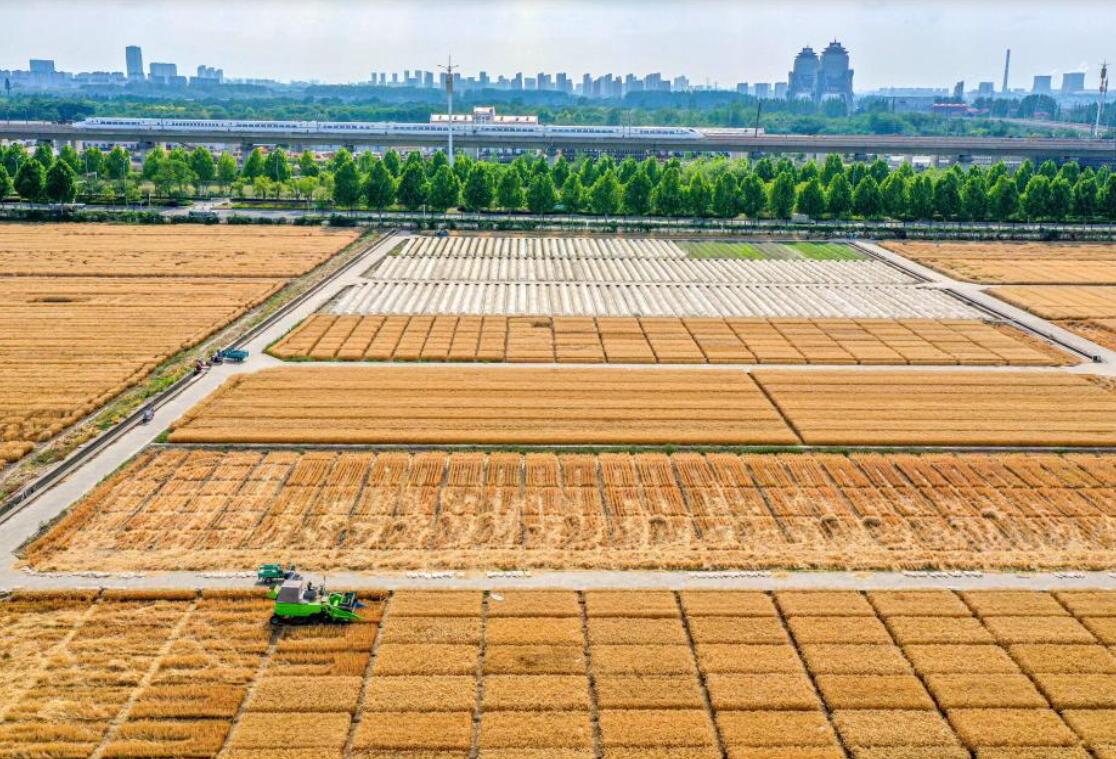 5月20日,在江苏里下河地区农科所(扬州市农科院)试验田,农民驾驶收割机收割小麦。