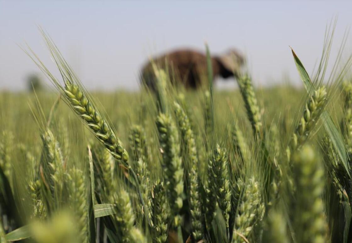 5月20日,在山东滨州沾化区冯家镇范庄村,农户在麦田里查看小麦长势。