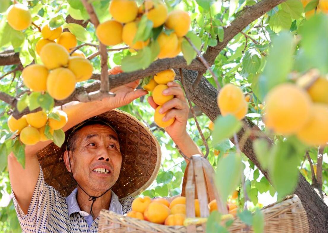 5月20日,山东枣庄市中区齐村镇凤凰岭村农民在果园采摘鲜杏。
