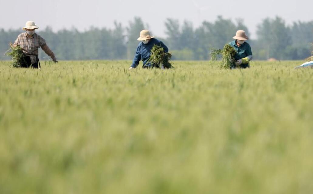 5月20日,河北沧州沧县捷地回族乡马辛庄村的农民进行麦种提纯作业。