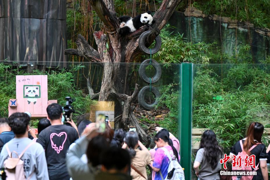5月29日,在树上睡觉的大熊猫幼崽“妹珠”吸引游客。中新网