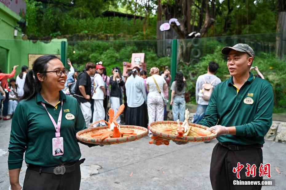 5月29日,大熊猫“萌萌”母女的特制“端午大餐”。中新网