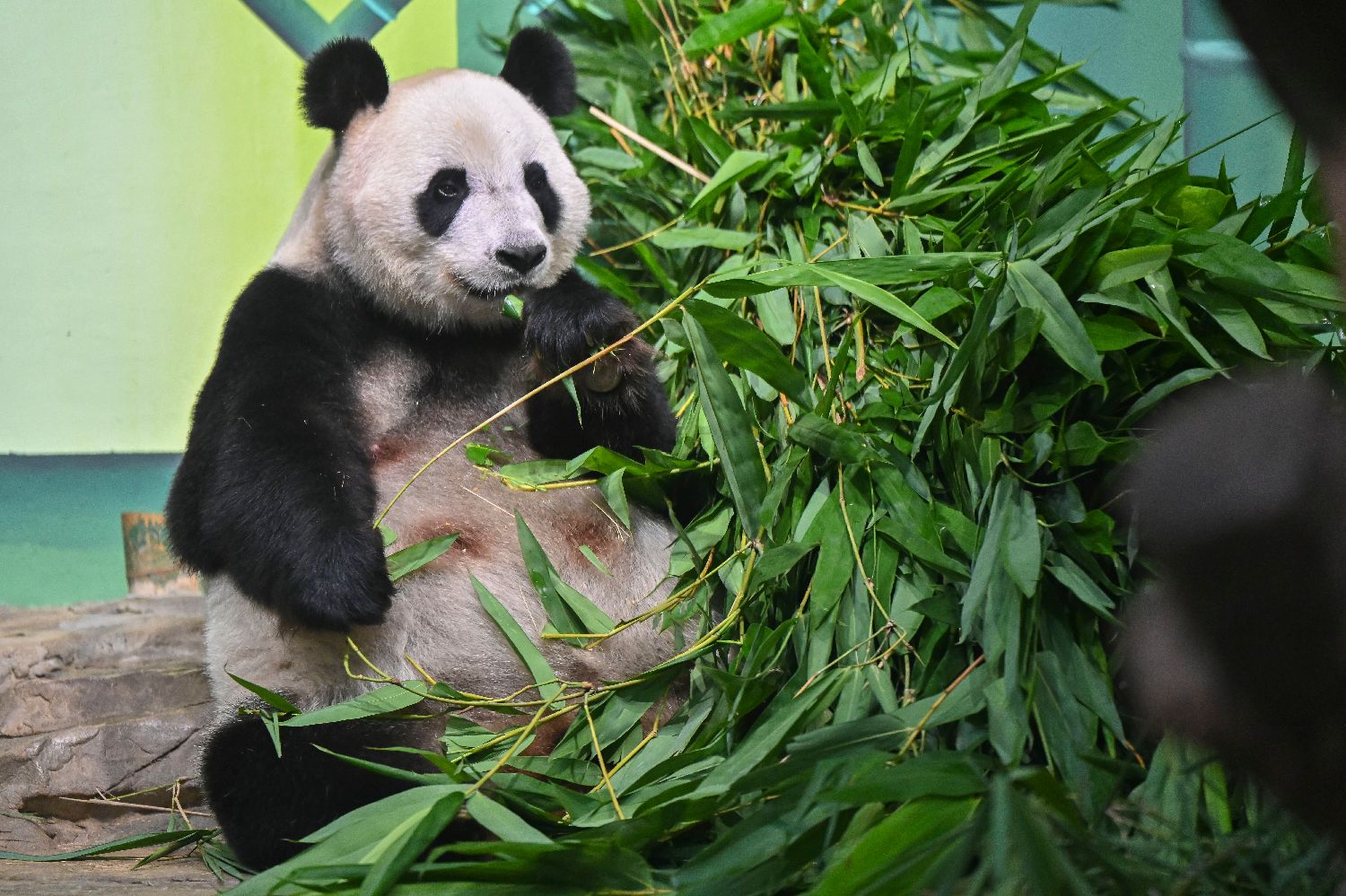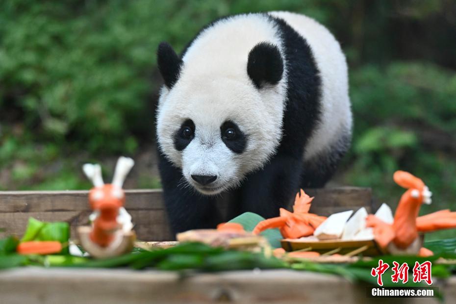 5月29日,大熊猫“萌萌”享用特制“端午大餐”。中新社