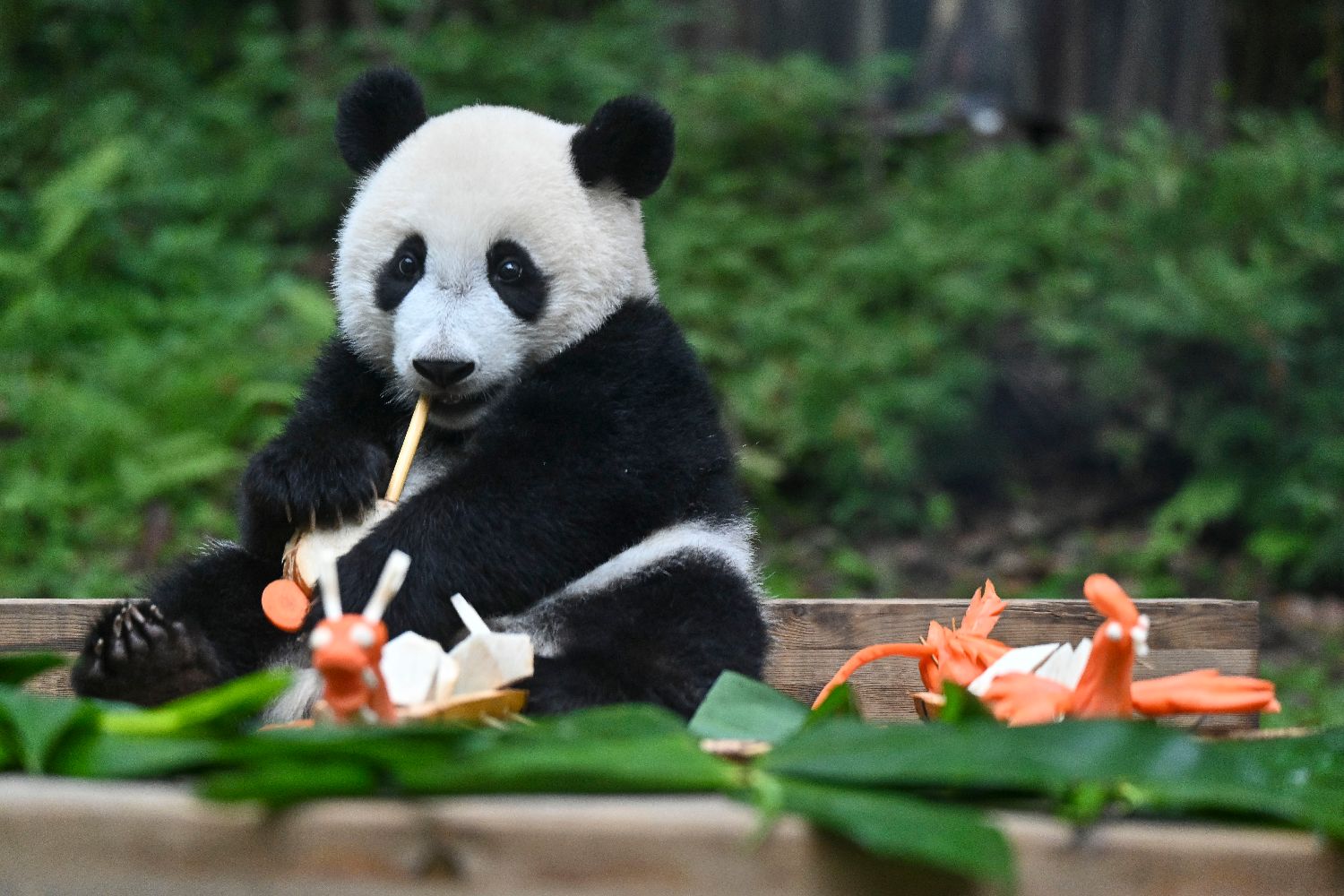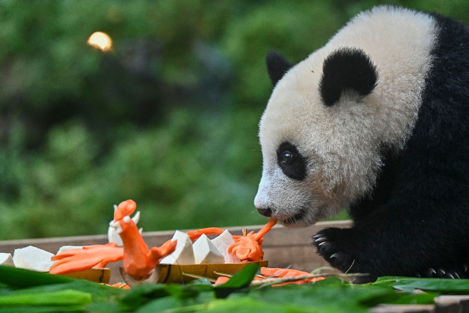 5月29日,广州长隆野生动物世界保育员用胡萝卜、竹子为大熊猫“萌萌”“妹珠”母女制作“端午大餐”。全球唯一大熊猫三胞胎中的大姐“萌萌”于2024年6月18日凌晨在长隆野生动物世界产下“妹珠”。图为当日,大熊猫幼崽“妹珠”享用特制“端午大餐”。中新社