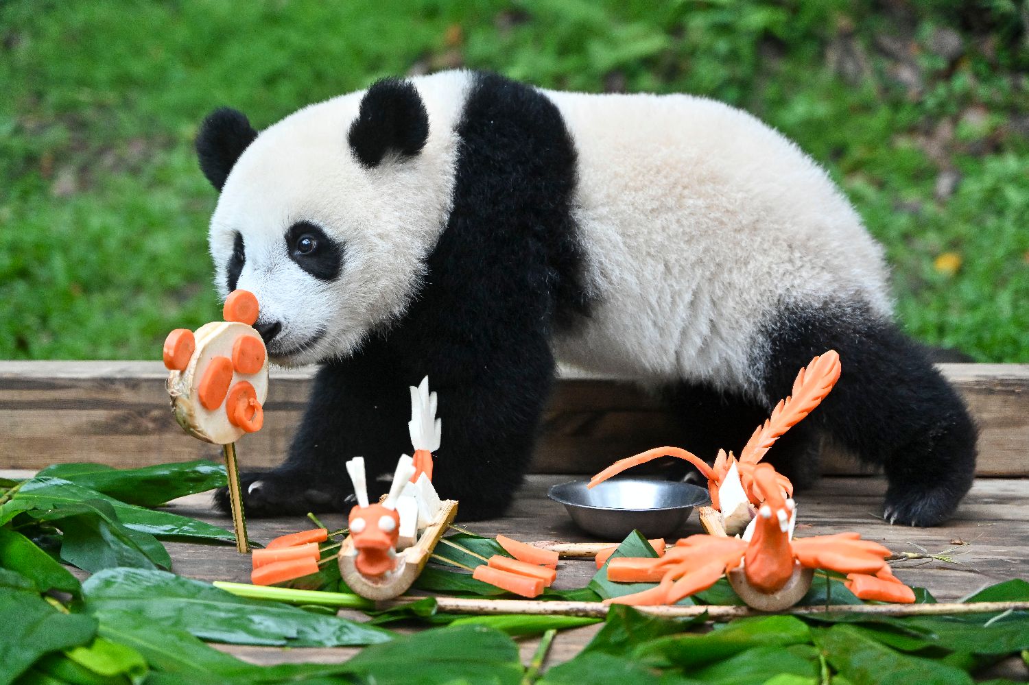 5月29日,大熊猫幼崽“妹珠”享用特制“端午大餐”。中新社