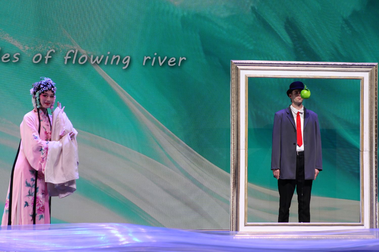 当地时间6月10日,“文明遇·鉴:中国大运河文化江苏周”在布鲁塞尔拉开帷幕,意在通过历史、风光、非遗、美食等主题,展示大运河江苏段的历史风貌与人文生活。图为开幕式上,来自江苏的锡剧演员与扮成比利时名画《人类之子》的演员“同框”,展现中西合璧的魅力。中新社
