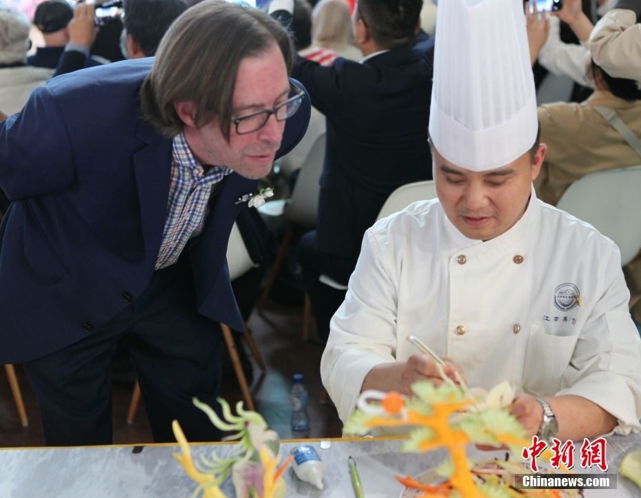 开幕式上,一名嘉宾观看江苏美食的雕工技艺。中新网