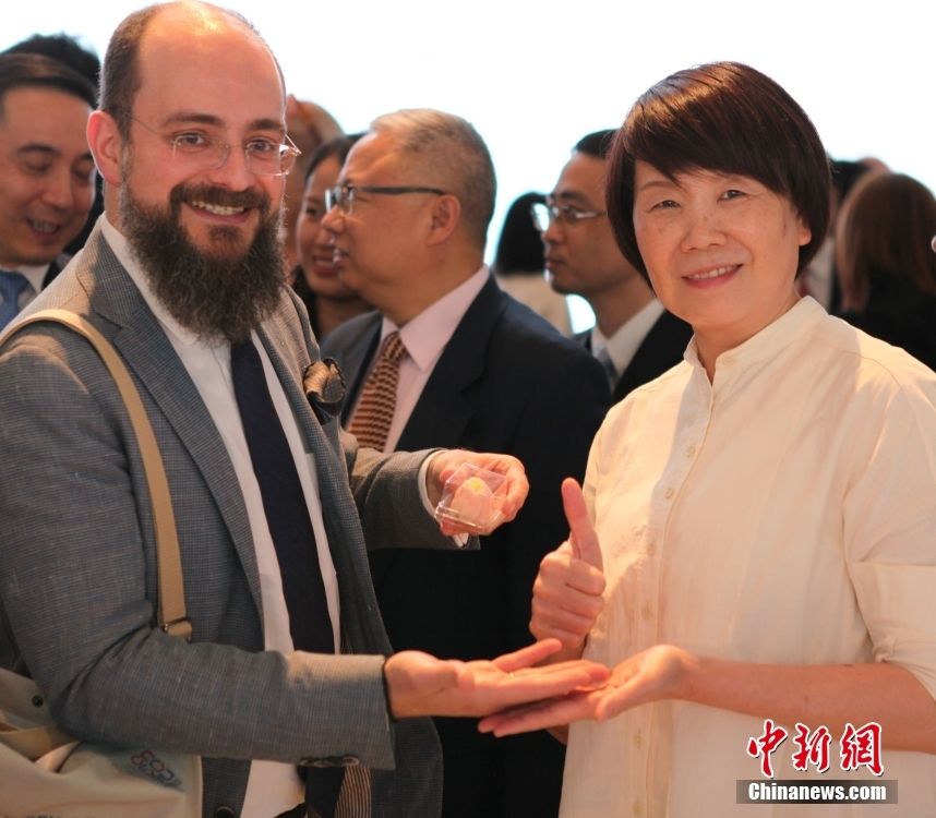 开幕式上,一名嘉宾手拿江苏宋式茶点,与糕点师合影。中新网