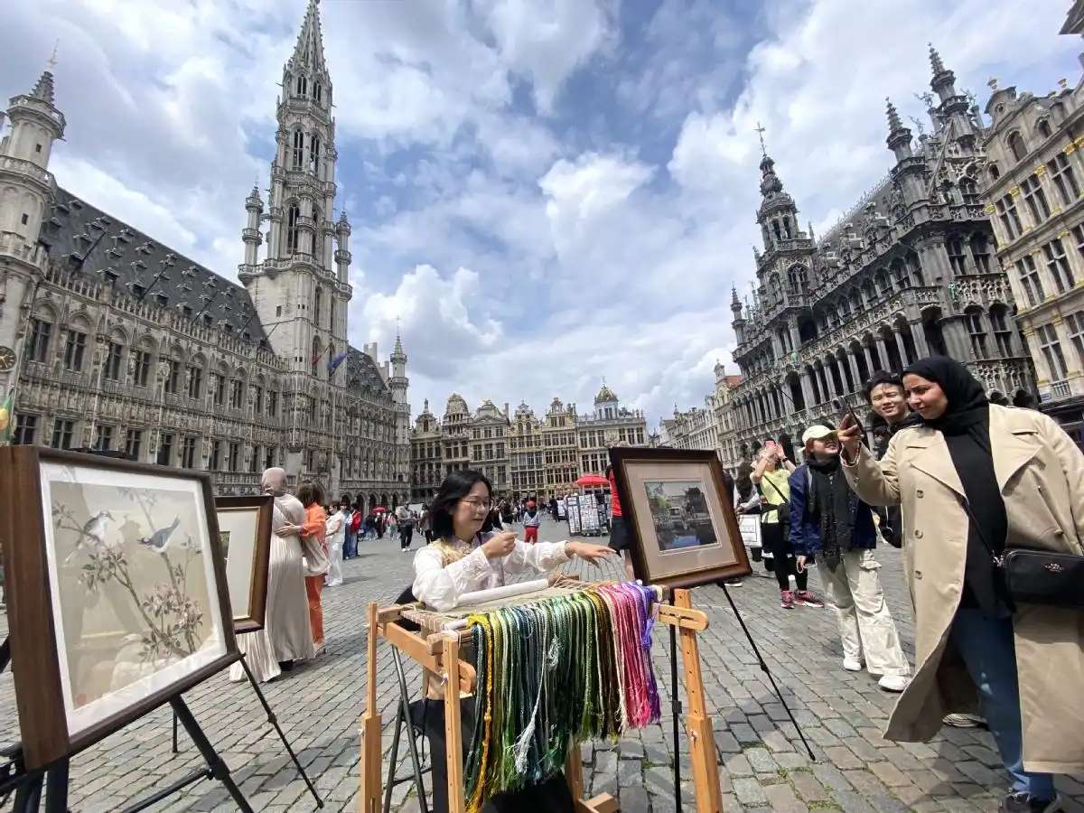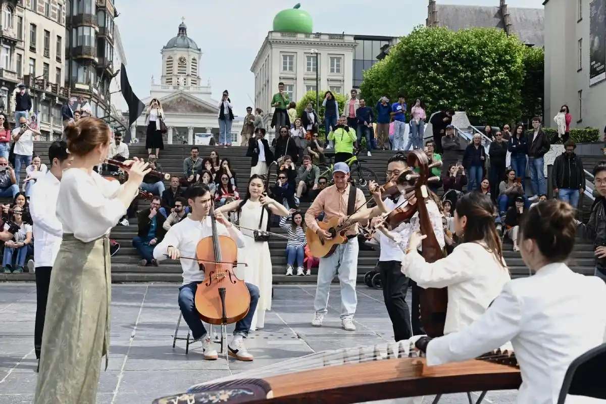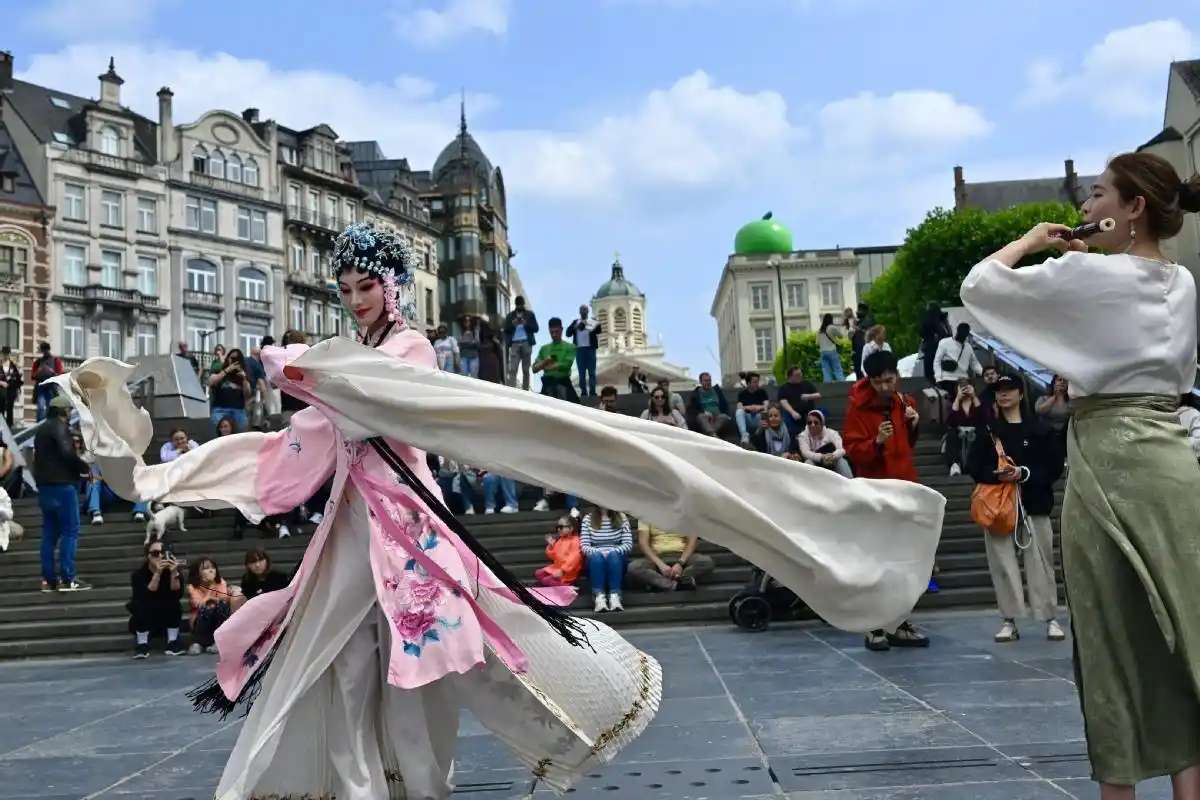 当地时间6月9日下午,一系列充满东方韵味的文化快闪活动在比利时布鲁塞尔艺术山和大广场精彩上演,为“文明遇·鉴:中国大运河文化江苏周”奏响序曲。图为来自无锡市锡剧院的青年演员进行快闪表演。中国日报网