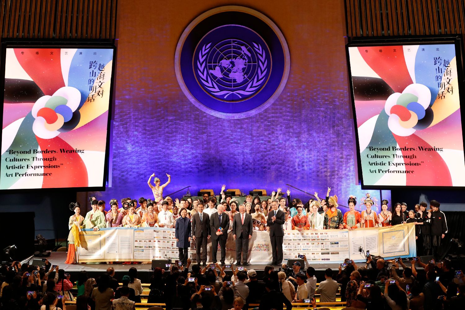 当地时间6月9日,中国在纽约联合国总部举办“文明对话国际日”主题活动,包括主题对话会、文明交流互鉴长卷展览以及“跨越山海的文明对话”文艺演出等活动。据悉,今年6月10日是首个联合国“文明对话国际日”。图为“跨越山海的文明对话”文艺演出结束后,联合国副秘书长兼文明联盟高级代表莫拉蒂诺斯(前排左三)、中国常驻联合国代表傅聪(前排右二)等与演职人员合影。中新社