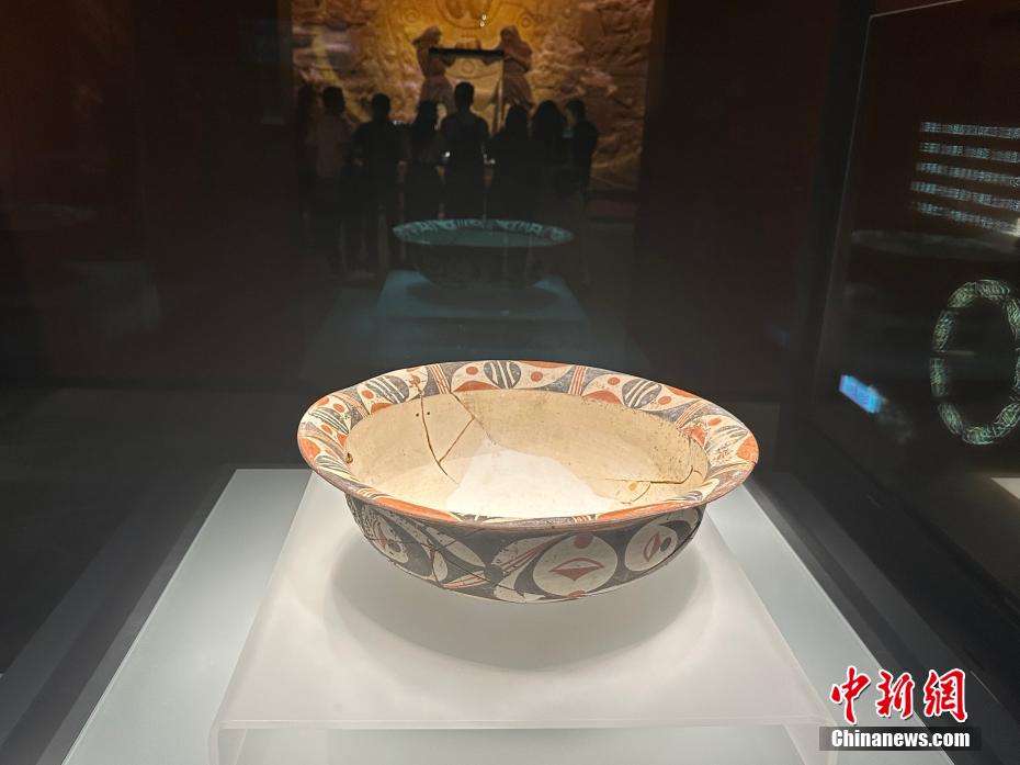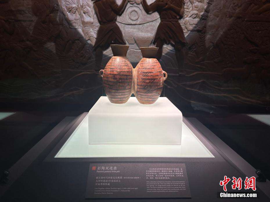 坐落于河南郑州东北部的郑州市大河村遗址博物馆新馆即将开馆试运行。作为中国首个全景式呈现仰韶文化的专题博物馆,该馆以“仰韶标尺·文明曙光”为核心设计理念,展陈面积7292平方米,设计了“大河汤汤”“大河流域:人类文明的摇篮”“仰韶文化:华夏文明的奠基者”“仰韶文化标尺:大河村遗址”“文明星火”五大篇章,系统陈列了1600余件(套)精品文物。馆内利用现代化数智技术,沉浸式探索5000年文化原脉,解码中华民族从原始聚落走向王朝文明的壮阔画卷。图为6月10日,河南郑州大河村遗址博物馆新馆展出的彩陶双连壶。中新社