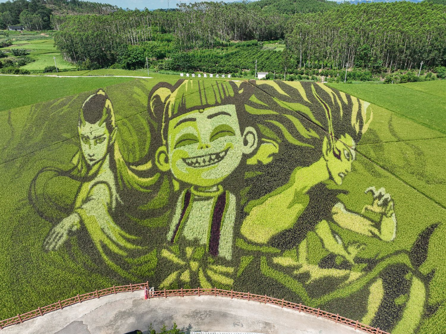 时值中国盛夏,千亩稻田呈现“稻浪连天碧”的壮观景象,稻田中由浅绿、深绿、墨绿等不同色系的水稻种植组合而成的图案,在平原上绘就了一幅幅生态田园画作。图为6月25日,航拍广西宾阳县古辣镇大陆村的巨幅稻田画《哪吒闹稻海》。该画作通过精准定位种植技术,使用多种色彩的水稻构成,正迎来最佳观赏期。(无人机照片)中新社