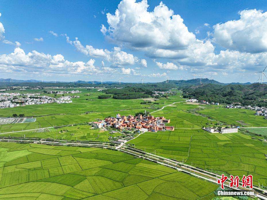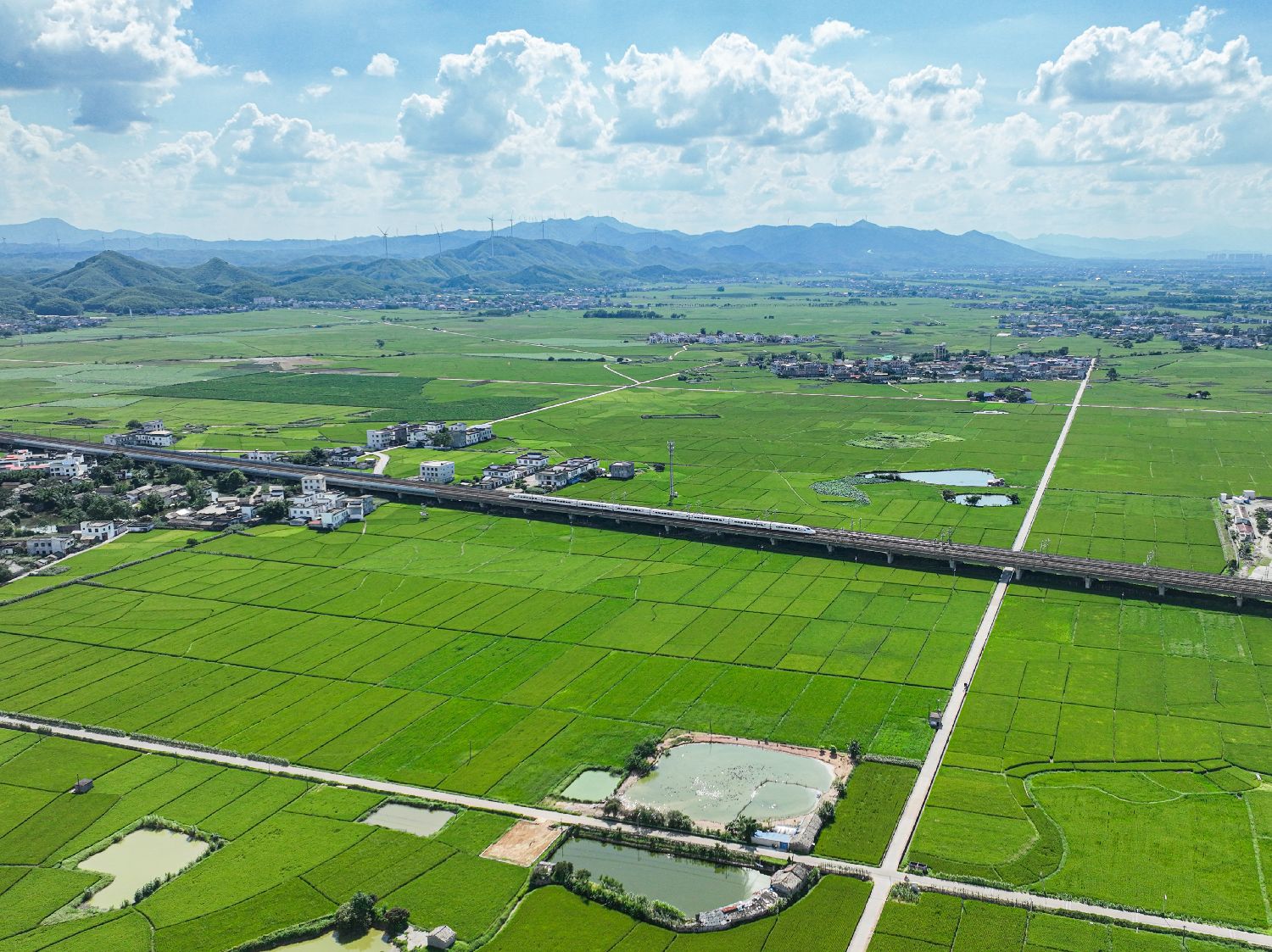 6月25日,航拍广西宾阳县古辣镇一带的稻田风光。稻田与途经的动车、远处的风电机组相映成趣,绘就出一幅广西现代乡村画卷。(无人机照片)中新社