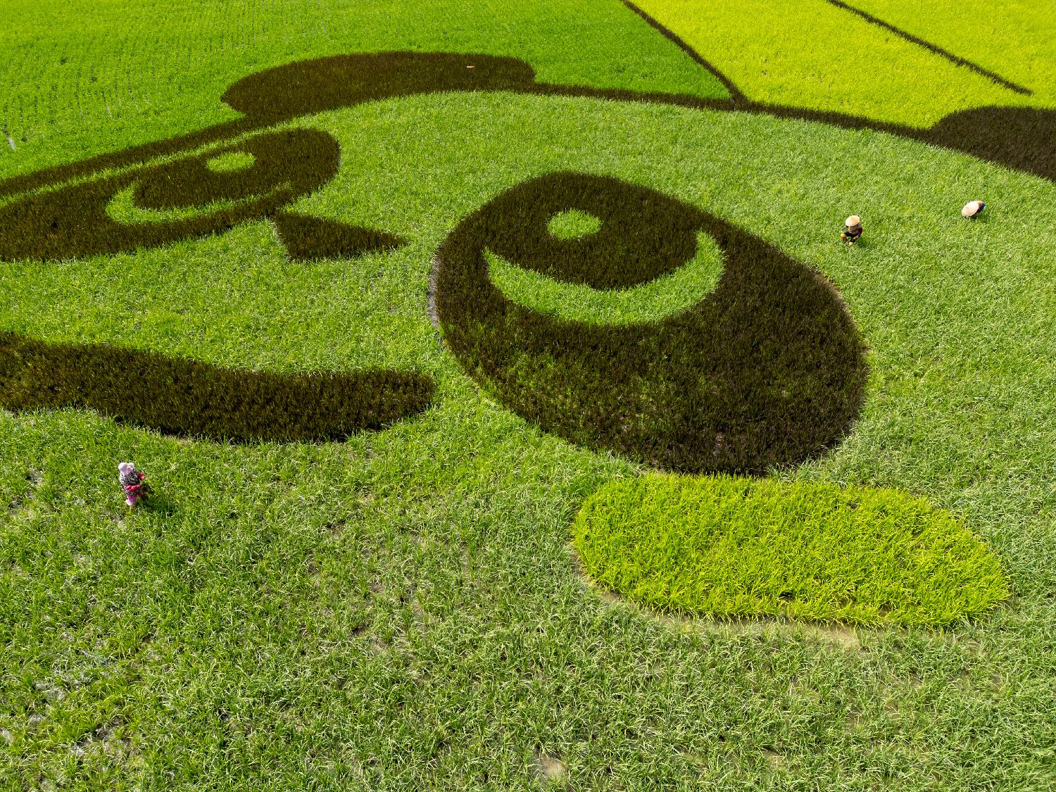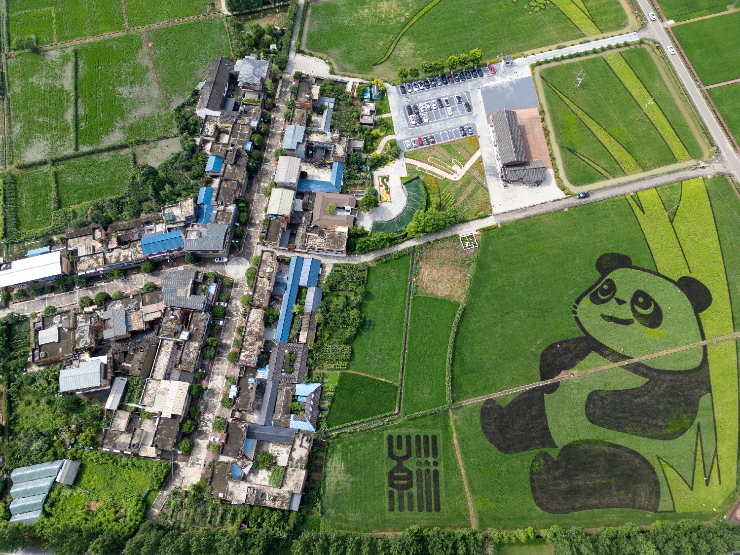 6月25日,在四川成都崇州市天府粮仓国家现代农业产业园,一幅巨型大熊猫图案镶嵌在万亩稻田中间。(无人机照片)中新社