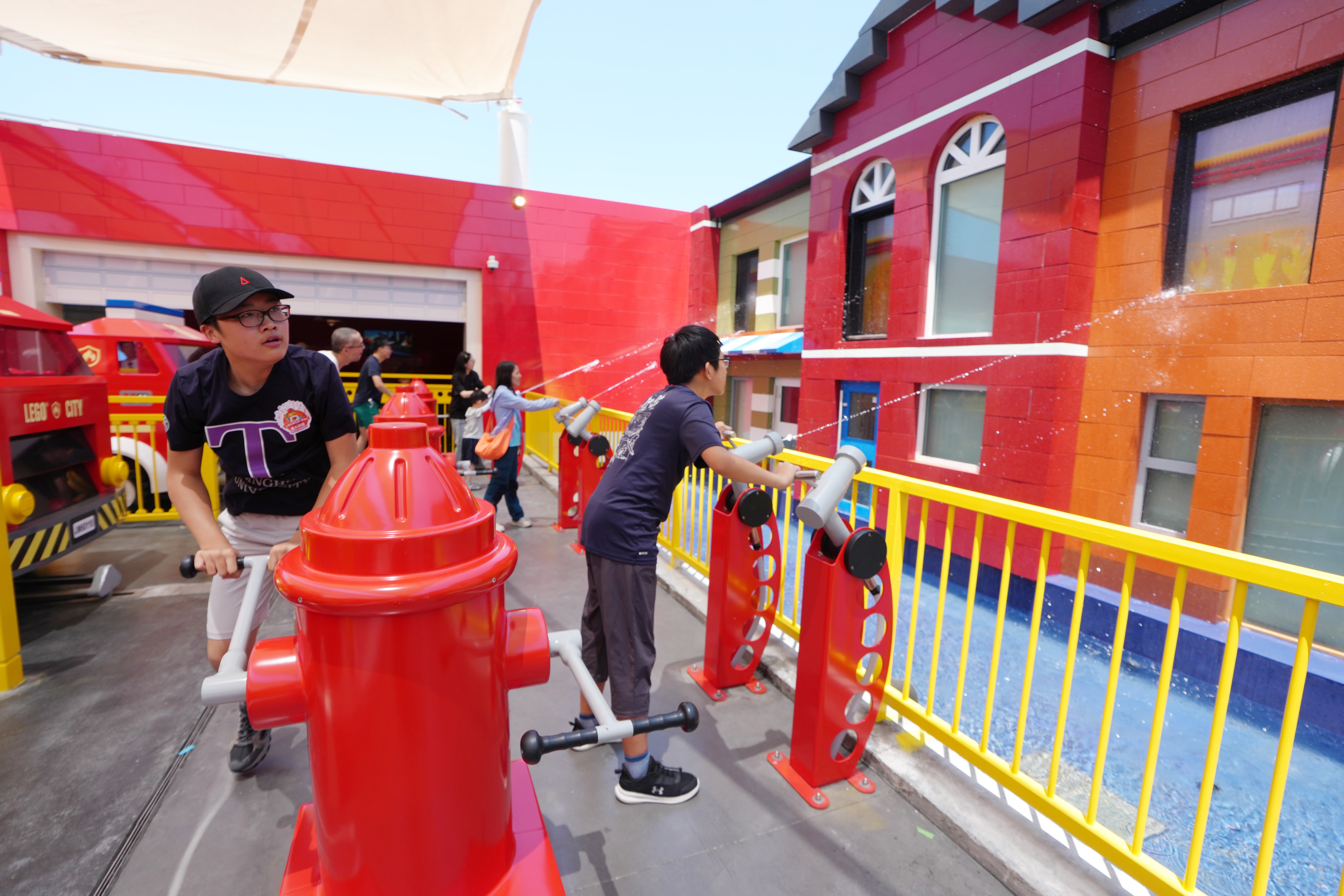 乐高消防学院内小游客相互配合完成“灭火”任务。中新社