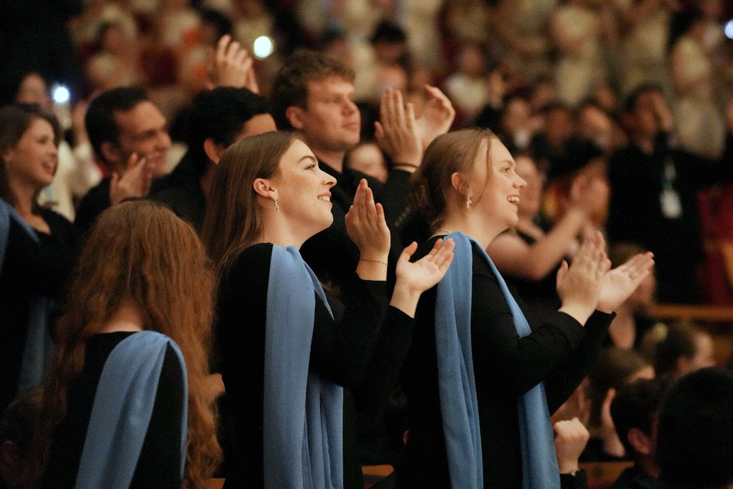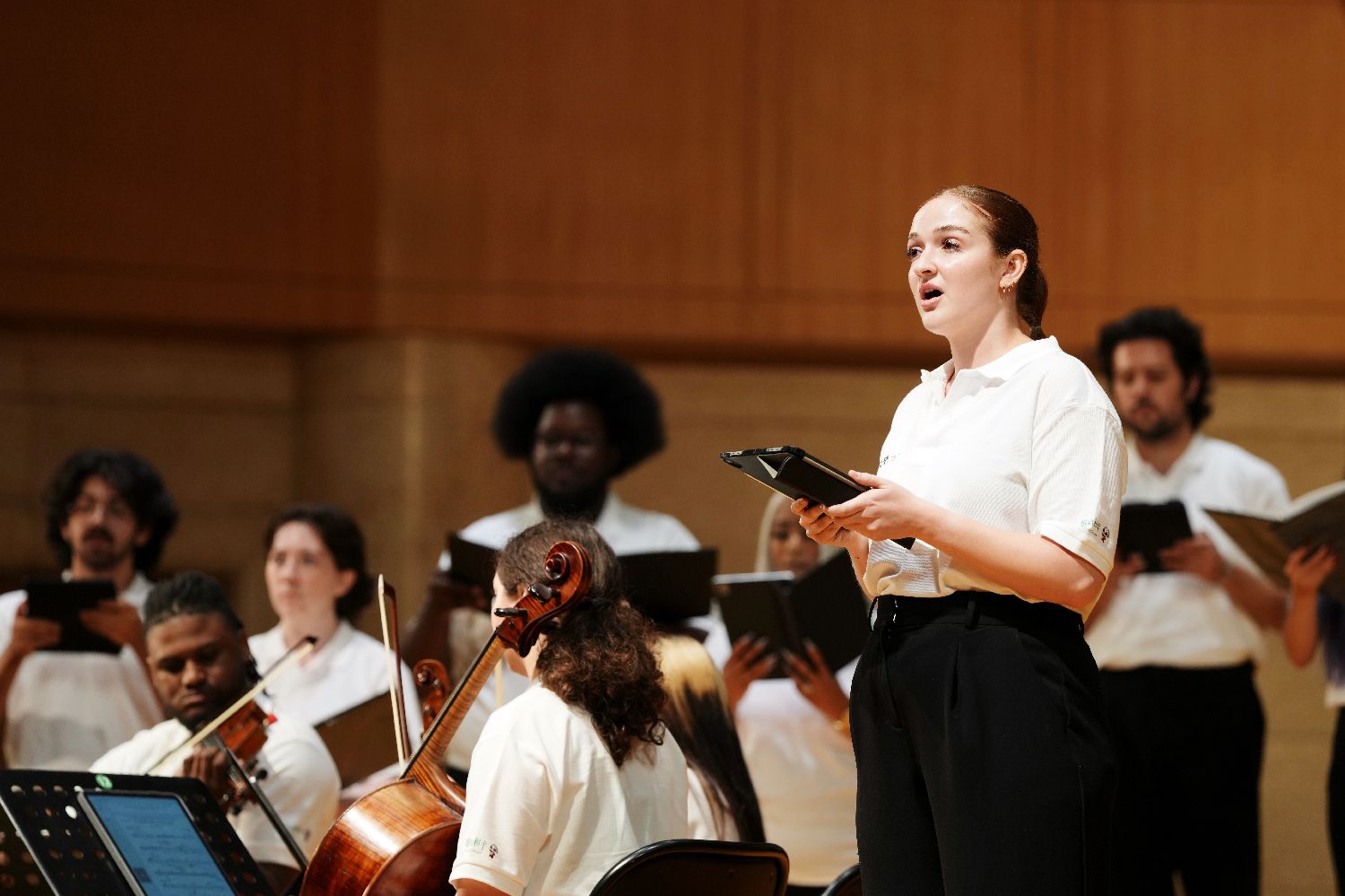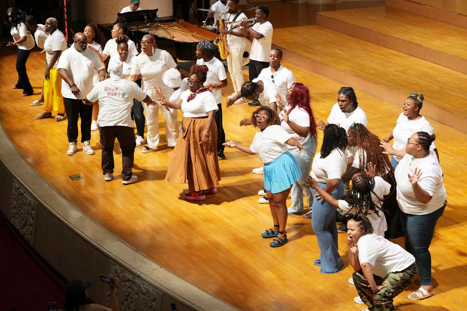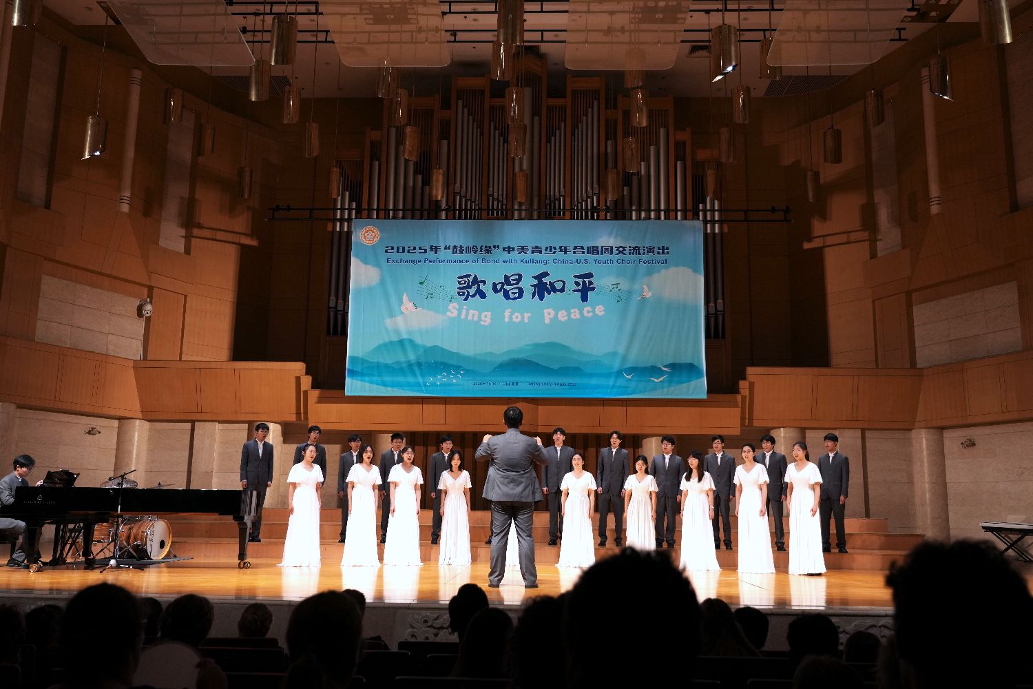 7月14日,2025年“鼓岭缘”中美青少年合唱周交流活动北京站的行程开启。美国青少年走进中国戏曲学院体验戏曲文化,在中山公园音乐堂进行交流演出。图为在中山公园音乐堂,美国风声合唱团演唱《Congratulations》。中新社