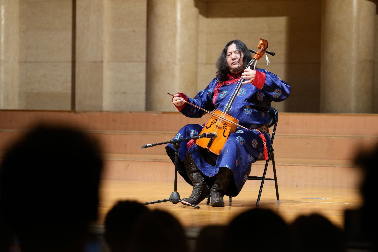 在中山公园音乐堂,中国马头琴演奏家朝克吉勒图演奏马头琴。中新社