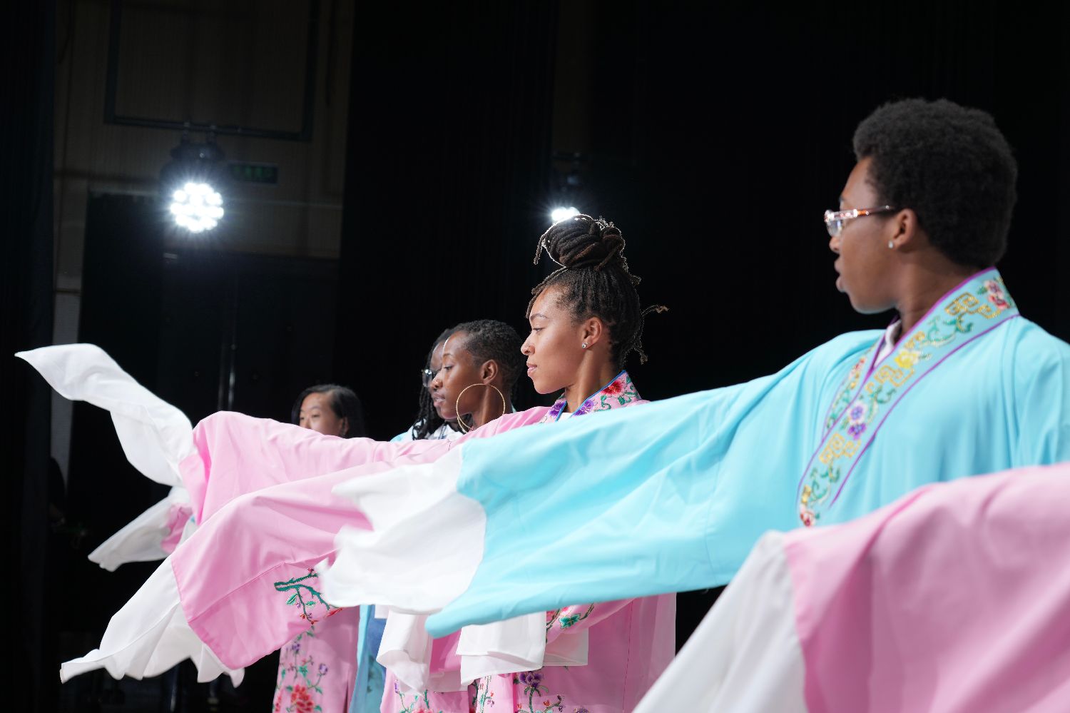 在中国戏曲学院,美国青少年在中国戏曲学院体验水袖。中新社
