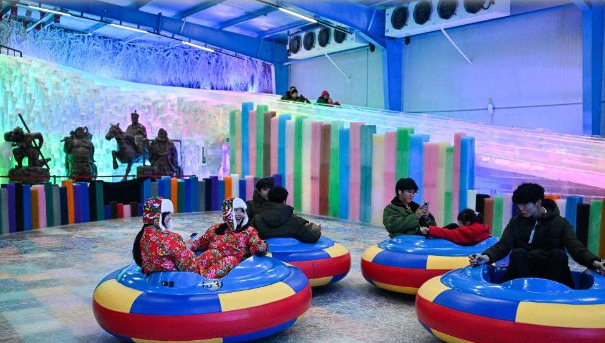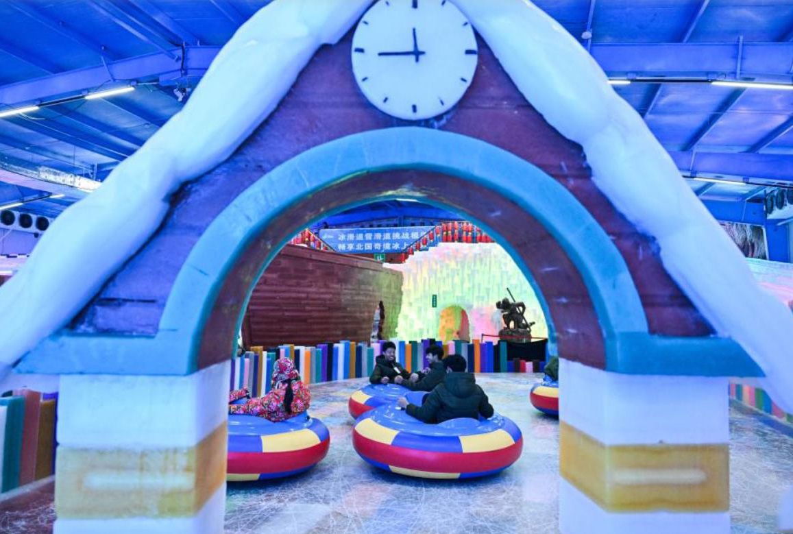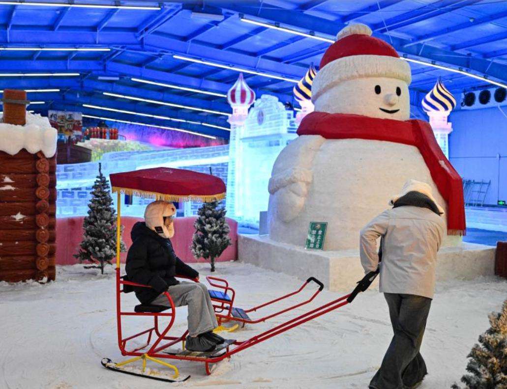 7月15日,游客在室内冰雪世界休闲娱乐。