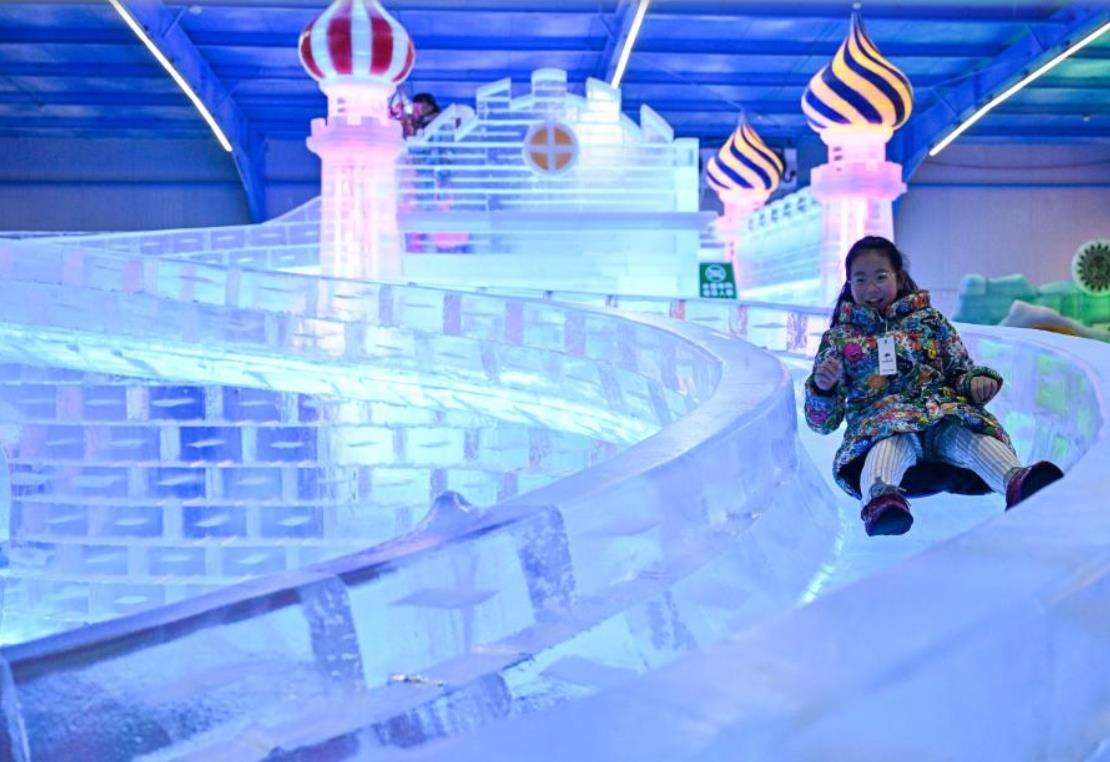 7月15日,小朋友在室内冰雪世界休闲娱乐。