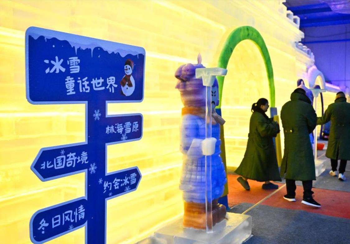 中国正值夏日,江苏淮安金湖水上森林景区内的春溪林海雪原迎来众多游客。据介绍,该室内冰雪世界由哈尔滨冰雕团队打造,面积超3000平方米,置身其中,仿佛走进冰雪童话世界,尽享夏日清凉。图为7月15日,游客在室内冰雪世界休闲娱乐。