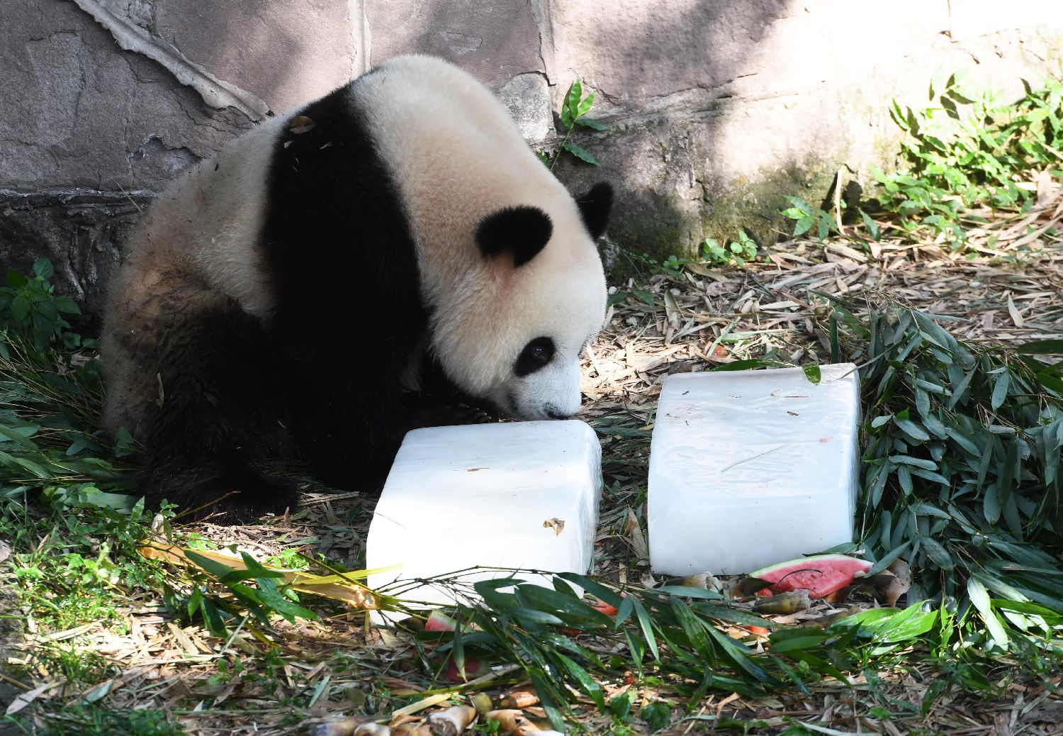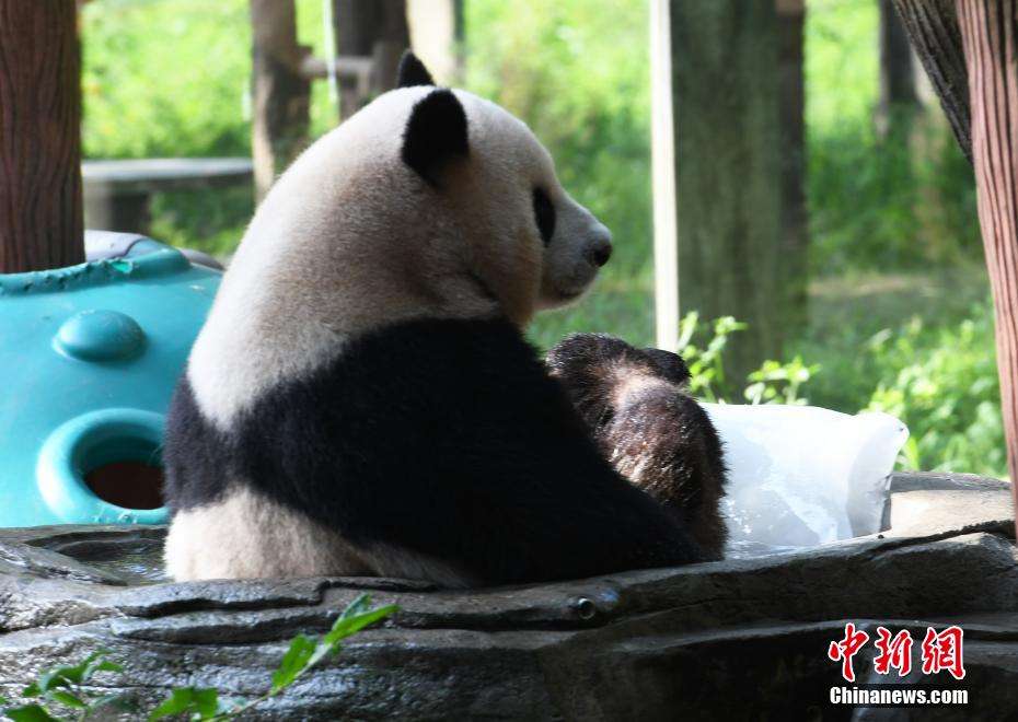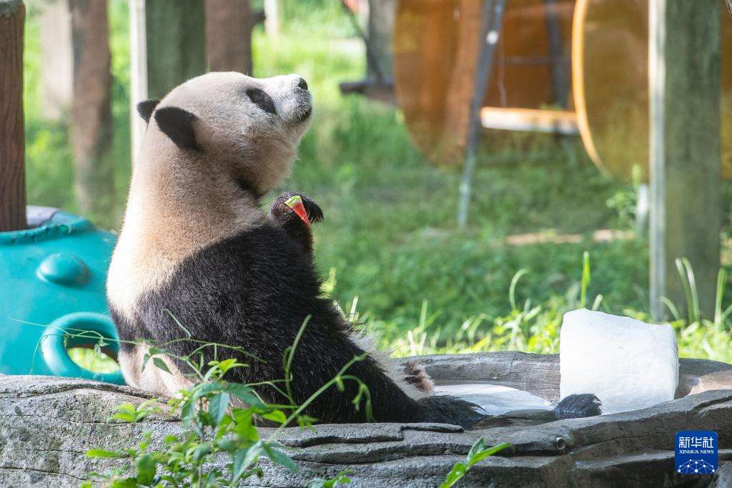 近日,重庆高温天气持续,重庆动物园通过给动物泡冰水、吹空调、喂西瓜等多种方式,让动物安然度夏。图为7月16日,重庆动物园的大熊猫玩冰砖、吃冰镇蔬果防暑降温。中新社