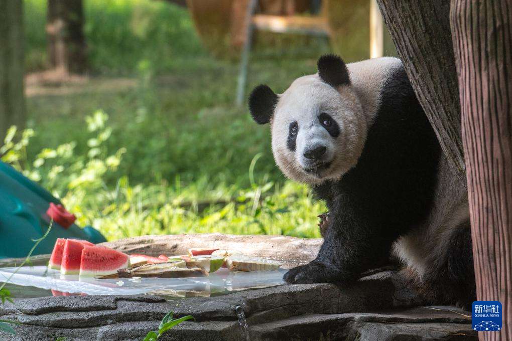 7月16日,大熊猫在重庆动物园吃冰镇水果。新华社