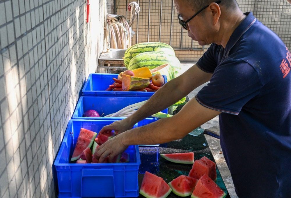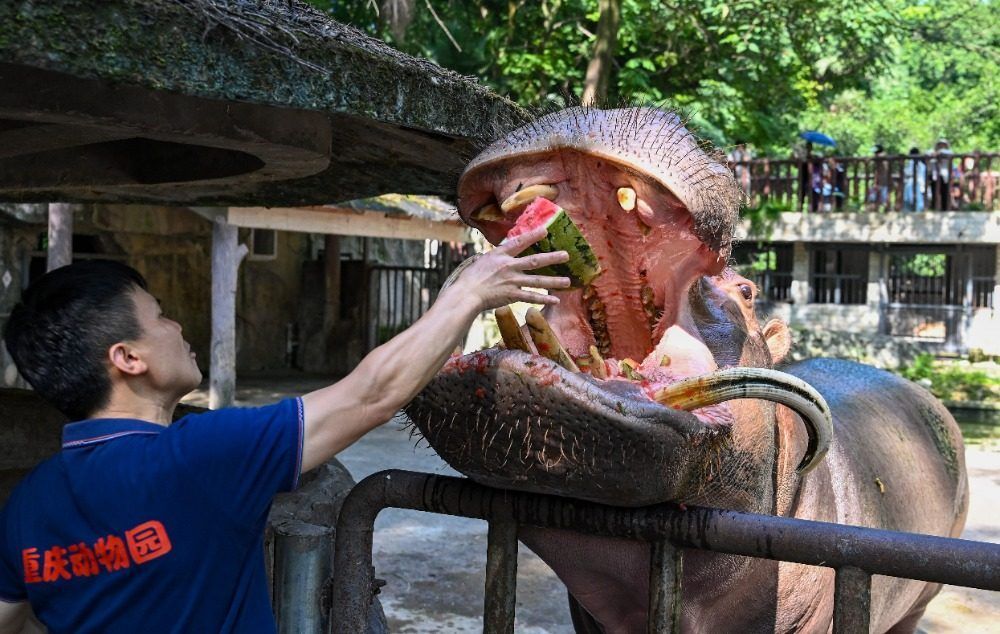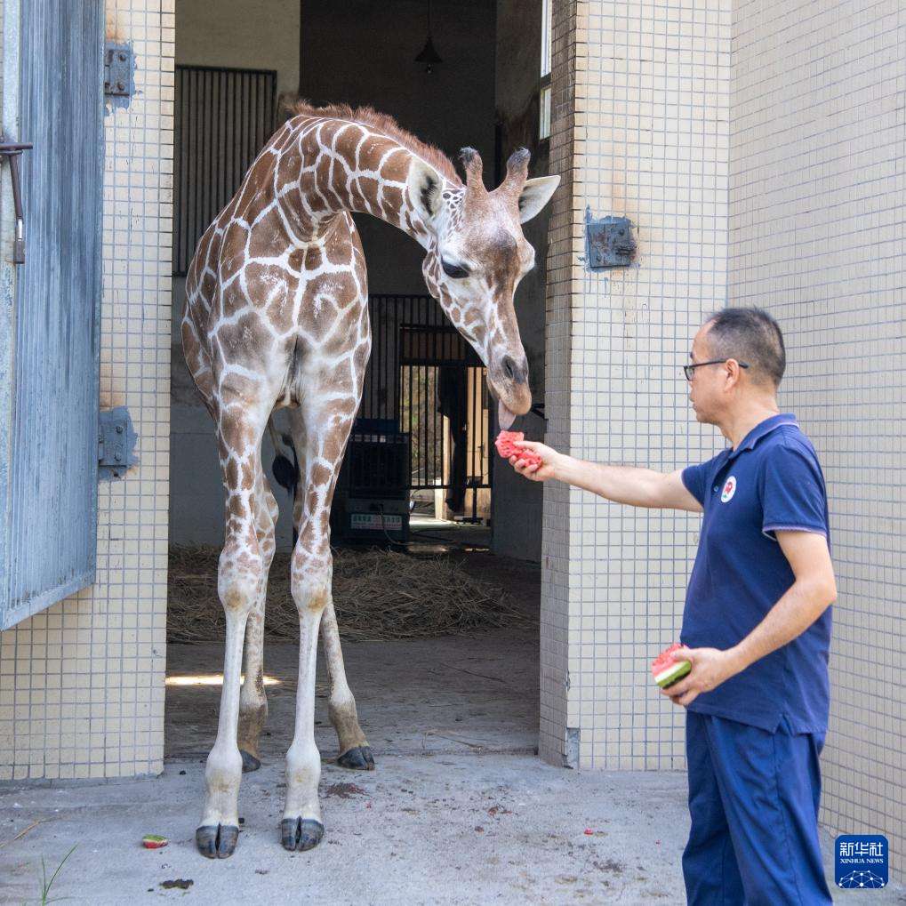 7月16日,饲养员给长颈鹿喂食冰镇西瓜。新华社