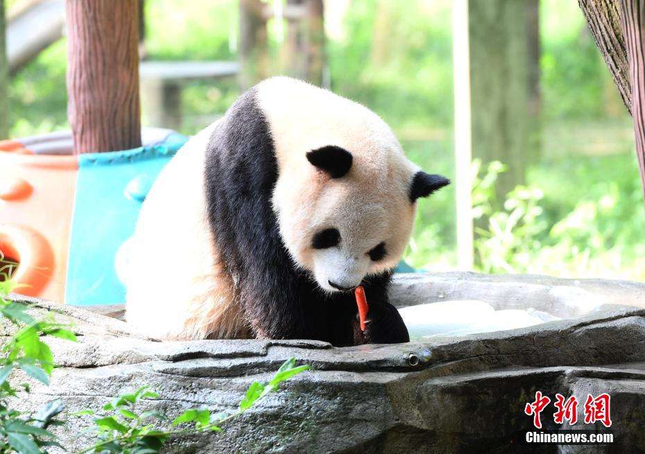 大熊猫一边洗冰水浴,一边吃胡萝卜。中新网