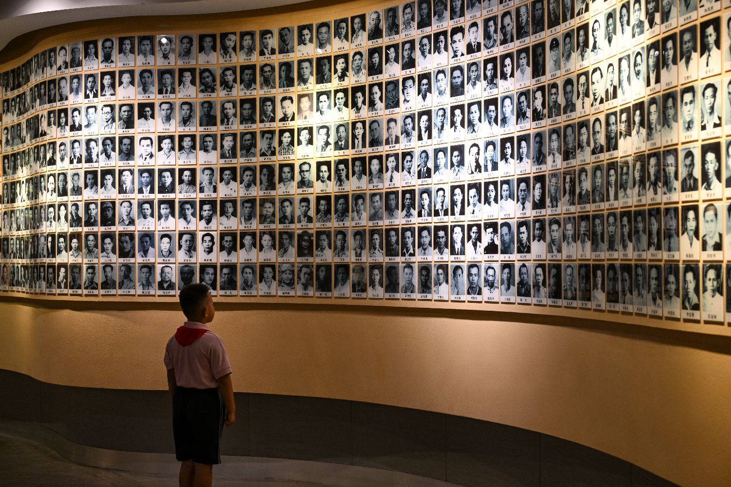 7月27日,一名小朋友站在南洋华侨机工英雄墙前。中新社