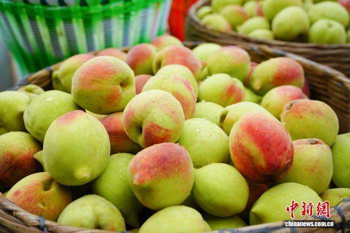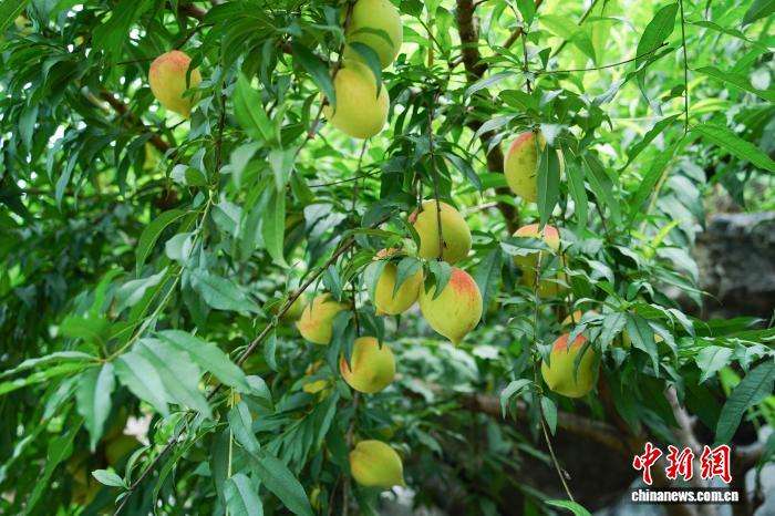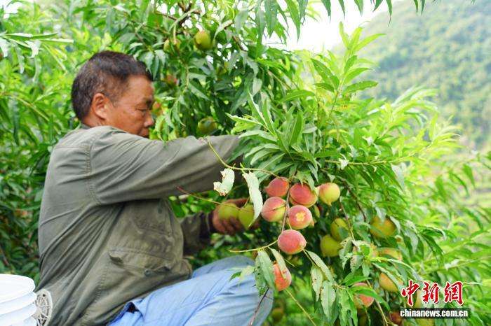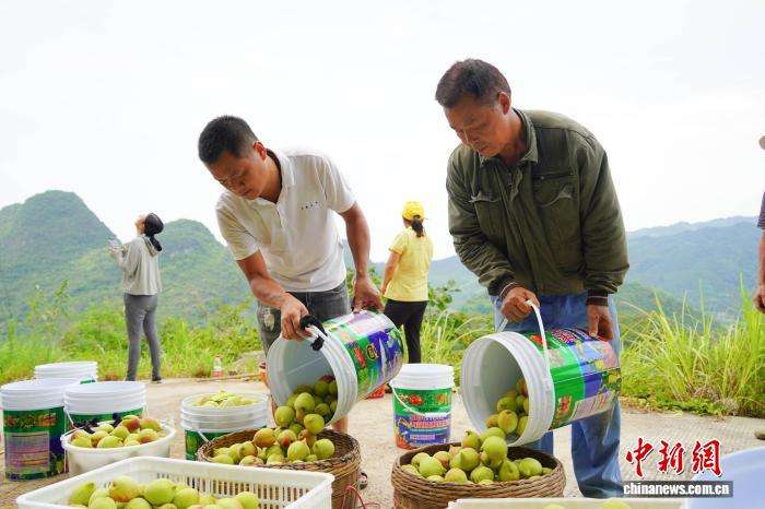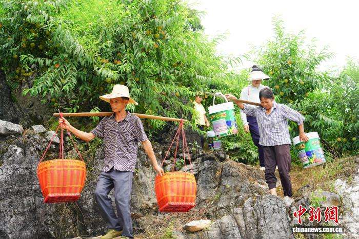 近日,在广西罗城仫佬族自治县东门镇榕木村牛坪屯,饱满圆润的鹰嘴桃压弯枝头,果皮泛着诱人红晕,在阳光下格外亮眼。果农们忙着采摘、分拣、打包鹰嘴桃,基地里一派丰收的景象。图为村民在采摘鹰嘴桃。