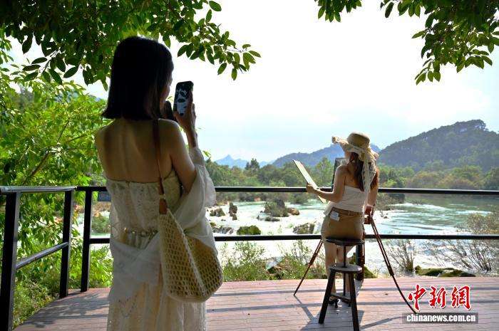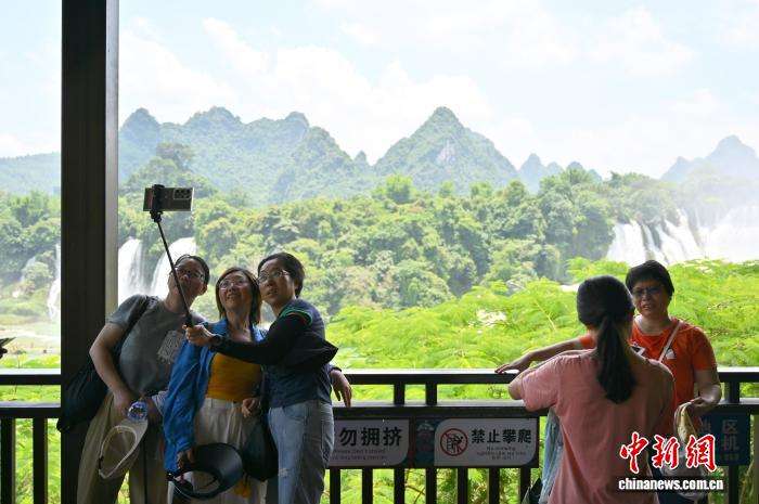 7月30日,位于广西崇左大新县的中越德天(板约)瀑布跨境旅游合作区迎来大批游客。正值德天瀑布丰水期,游客乘竹筏在瀑布下跨国观瀑;中越界河归春河旁,人们品越南咖啡、赏边关风情。作为中国首个跨境旅游合作区,这里暑期跨境游火爆,不少中国游客自驾到此,感受当日往返越南的游玩体验。图为游人打卡德天瀑布景区。