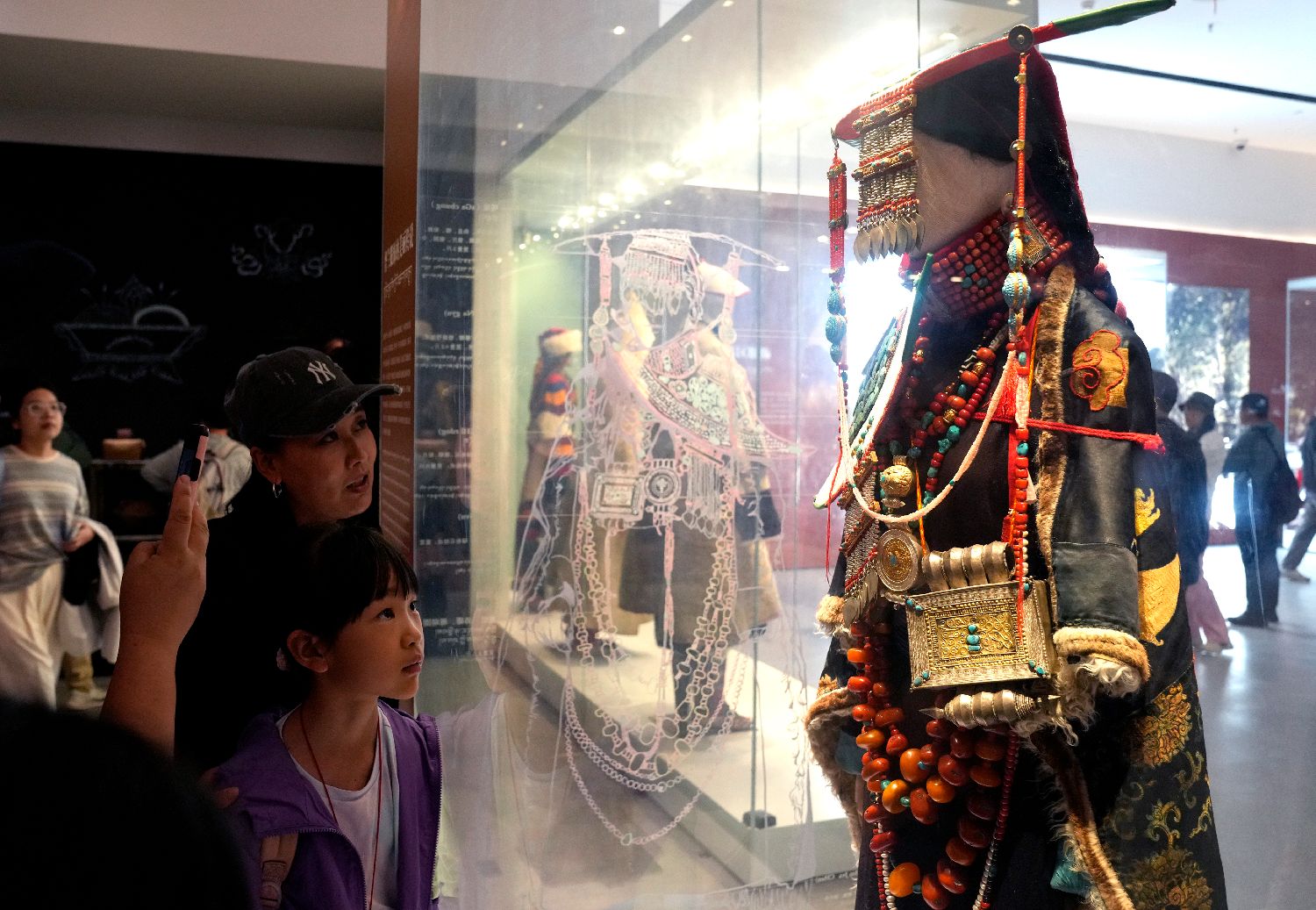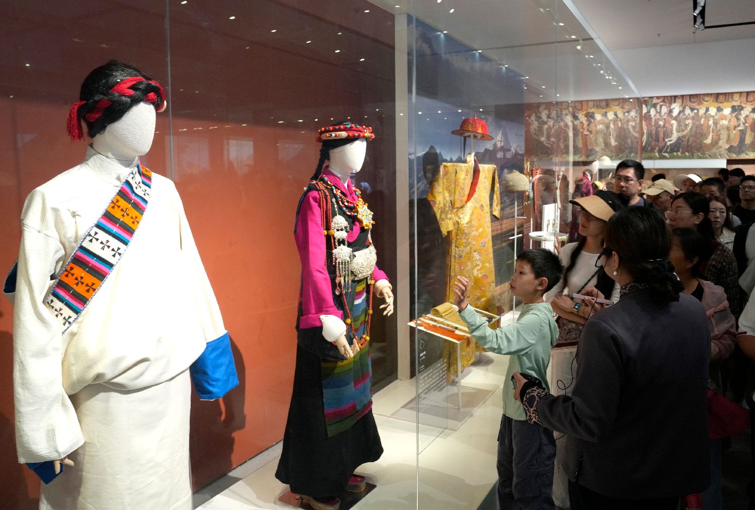 8月5日,游客参观西藏博物馆内展出的日喀则定日服饰。中新社