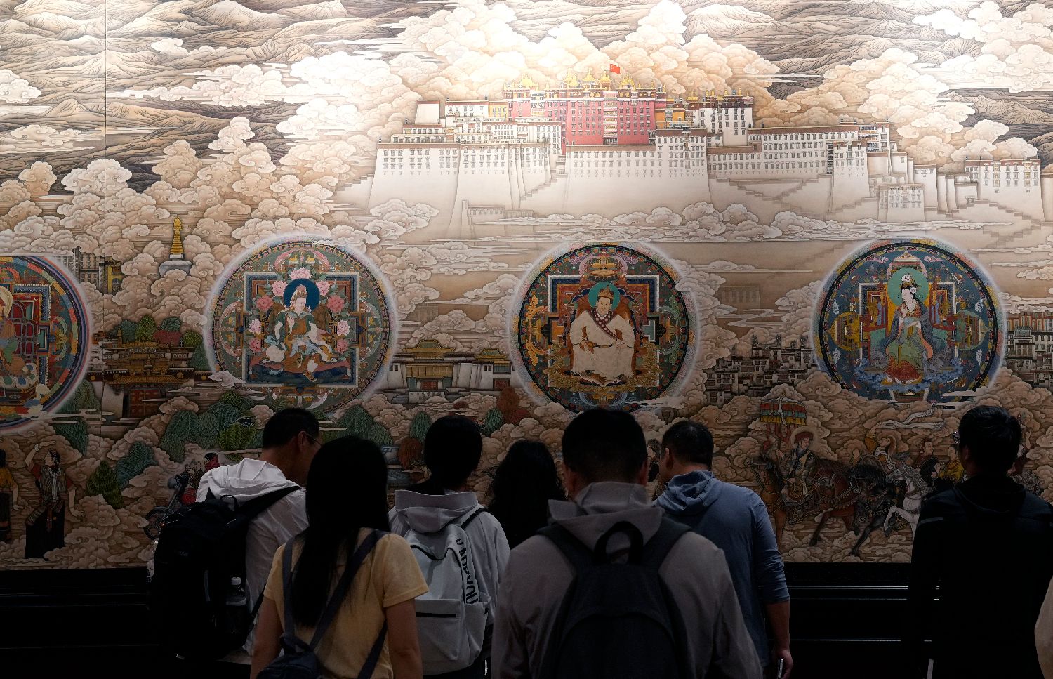 8月5日,游客参观西藏博物馆内展出的唐卡。中新社