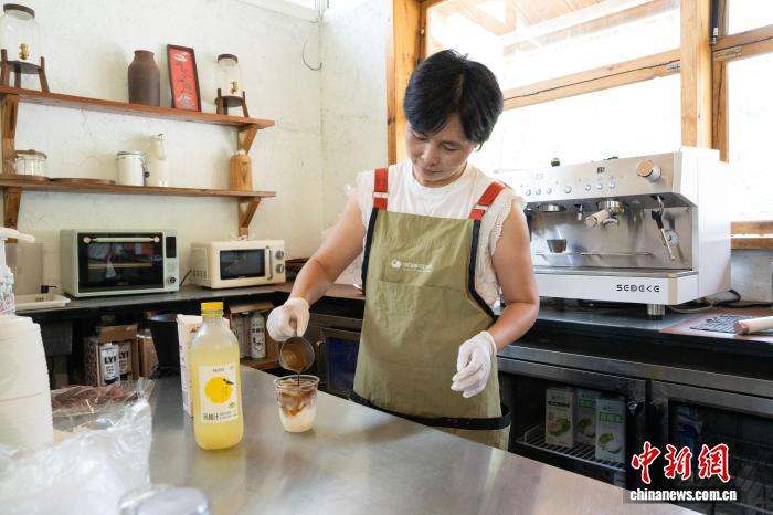 8月10日,返乡创业的村嫂曾美君在羊棚咖啡馆制作具有当地特色的“柚香拿铁”。中新网