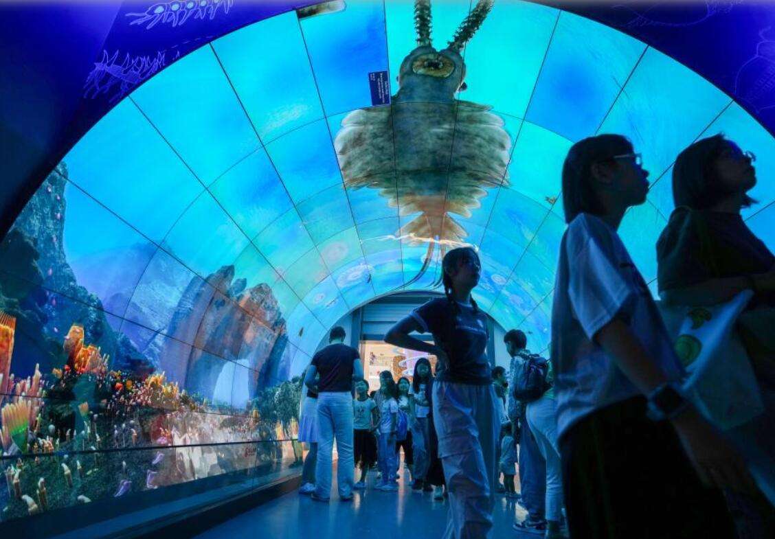 澄江化石地位于云南玉溪市澄江县的帽天山上,1984年由古生物学家侯先光发现。经过众多科学家数十年的研究与整理,身长两米的奇虾、抚仙湖虫等约200个物种的珍稀化石陆续被发现。澄江化石群作为寒武纪地球生命大爆发的化石遗迹,被称为“20世纪最惊人的发现之一”。2012年,作为地球生命演化历史的杰出范例,澄江化石地被列入《世界遗产名录》,填补了中国没有古生物化石自然遗产的空白。图为游客在澄江化石地世界自然遗产博物馆“寒武纪海底隧道”参观。