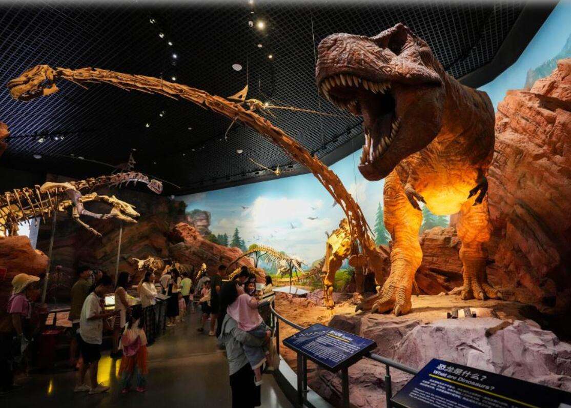 游客在澄江化石地世界自然遗产博物馆参观恐龙模型及化石。