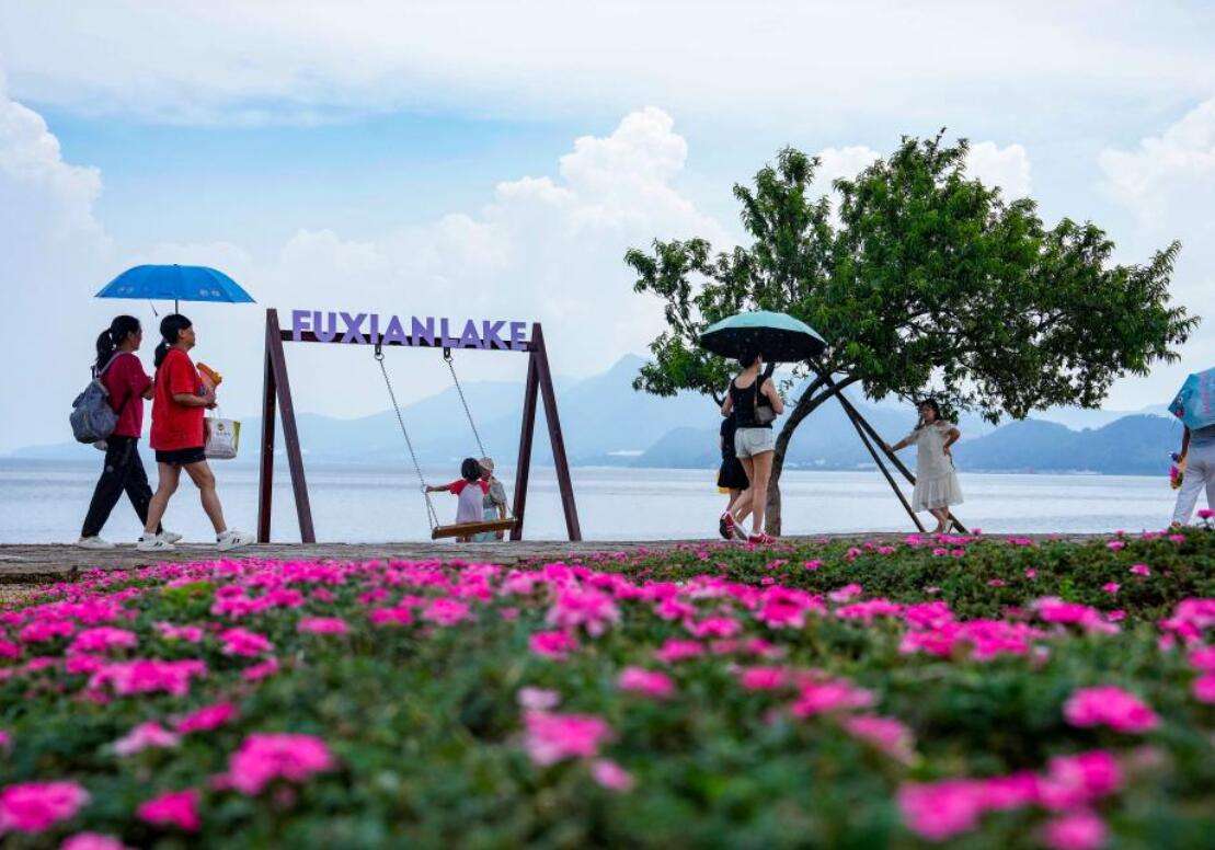 游客在抚仙湖边观光游览。