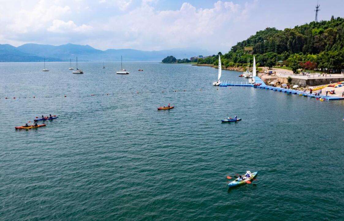 游客在抚仙湖上体验皮划艇。