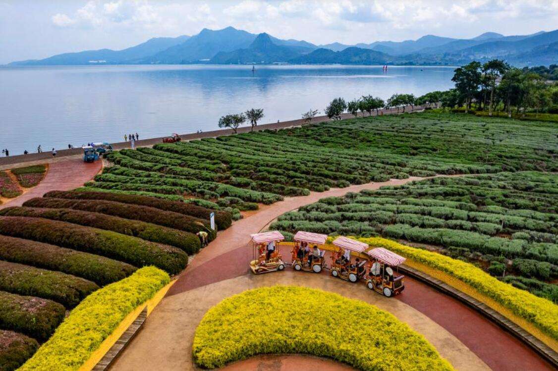 游客在抚仙湖边乘坐观光车游玩。