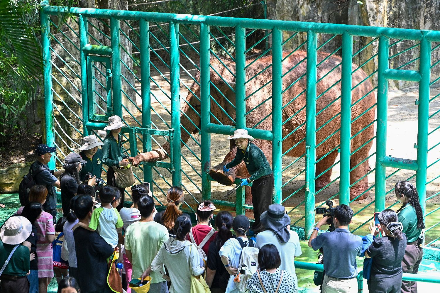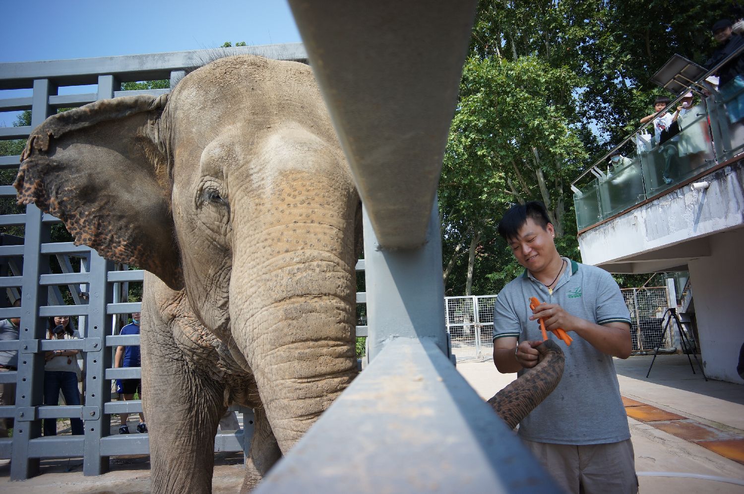 广州长隆野生动物世界的保育员向游客讲解大象足部护理知识。中新社