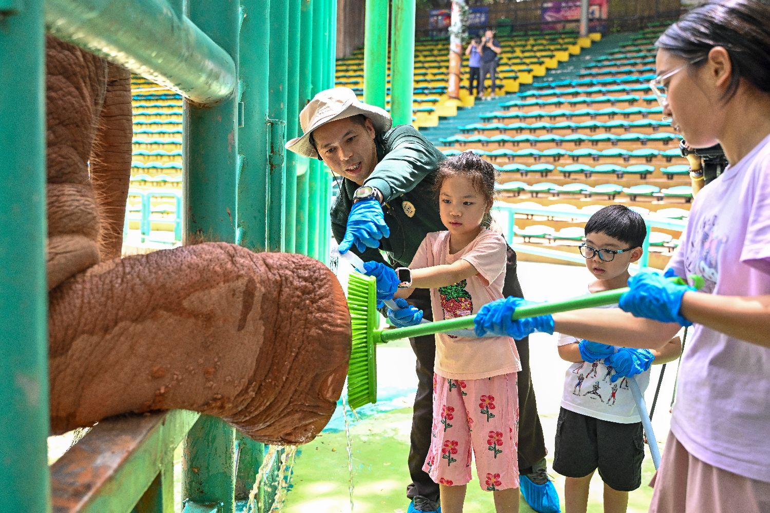 小朋友在保育员的指导下为大象清洁象足。中新社