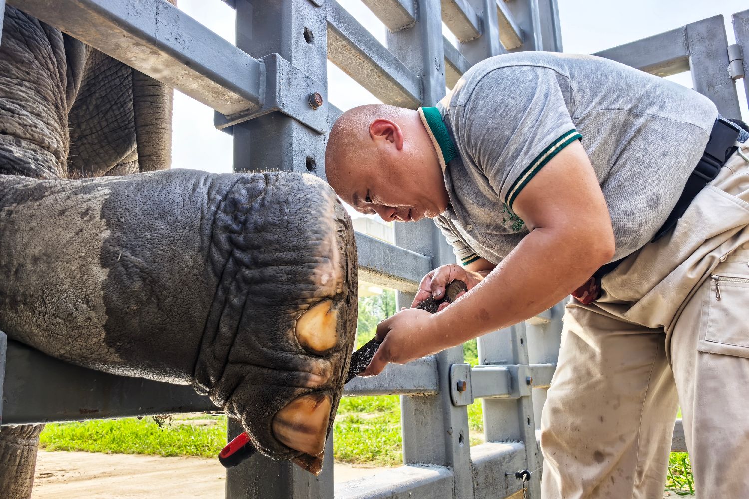 天津动物园举办“象趣无限·守护同行”主题活动,工作人员为园中的大象准备了“美食盲盒”“美甲”“称体重”等活动,让市民和游客解锁这些温柔巨兽的“象”样时光。图为保育员为母象“索恩”做“美甲”(蹄部护理)。中新社