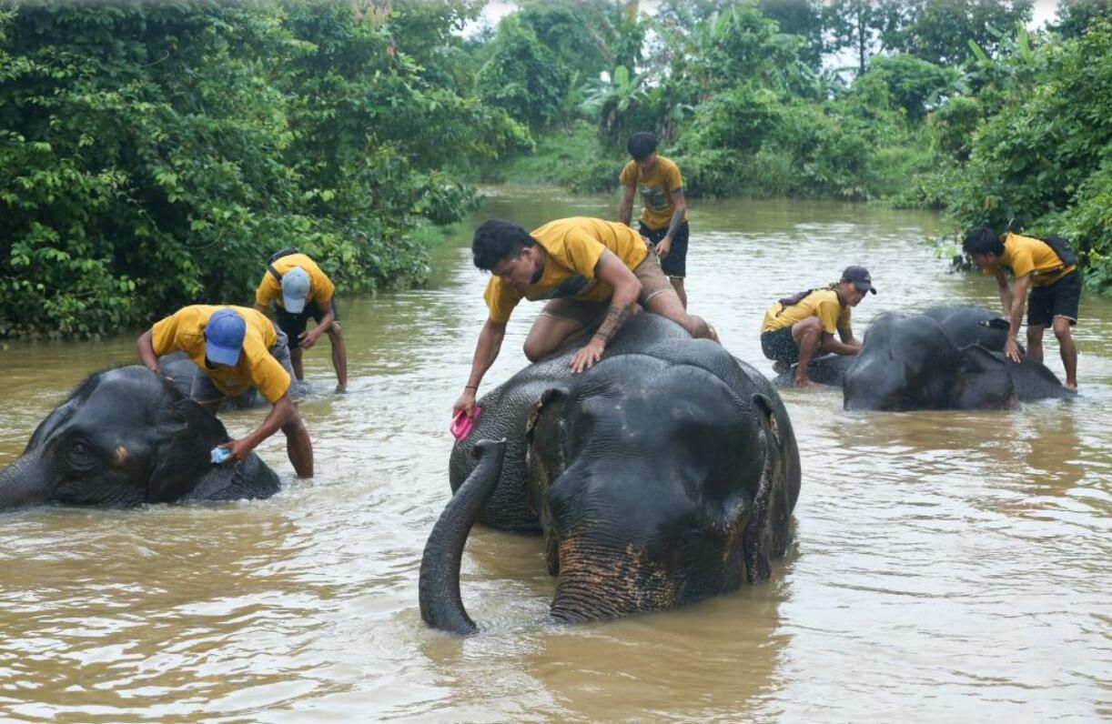 缅甸勃固省的温加波大象营地内,工作人员帮助大象洗澡。位于缅甸勃固省的温加波大象营地建于2016年,致力于救助和收养大象“孤儿”。新华社