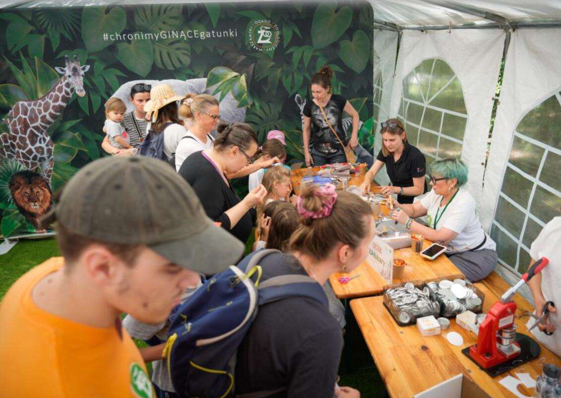 在波兰华沙动物园,人们参加世界大象日活动时体验手工制作。新华社