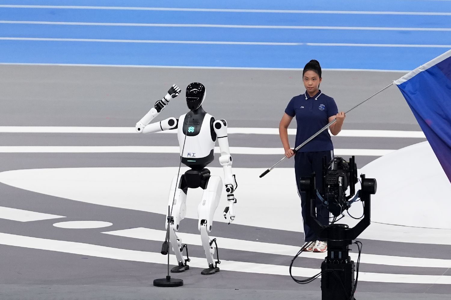 机器人运动员代表——天工机器人宣誓。中新社