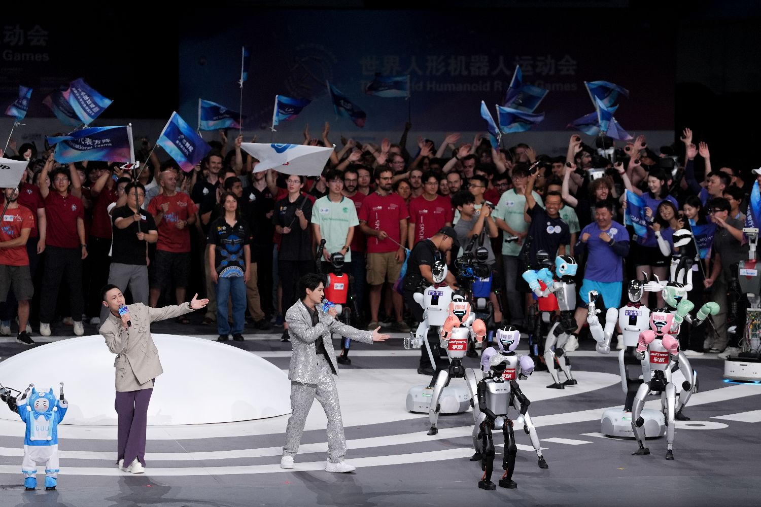 开幕式上共同合唱主题歌《智竞向未来》。中新社