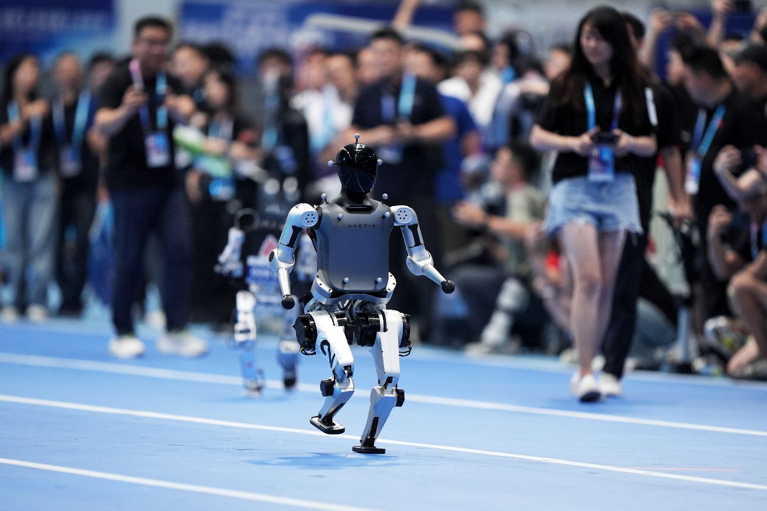 工作人员操控机器人在开幕式上开展100米赛跑。新华社