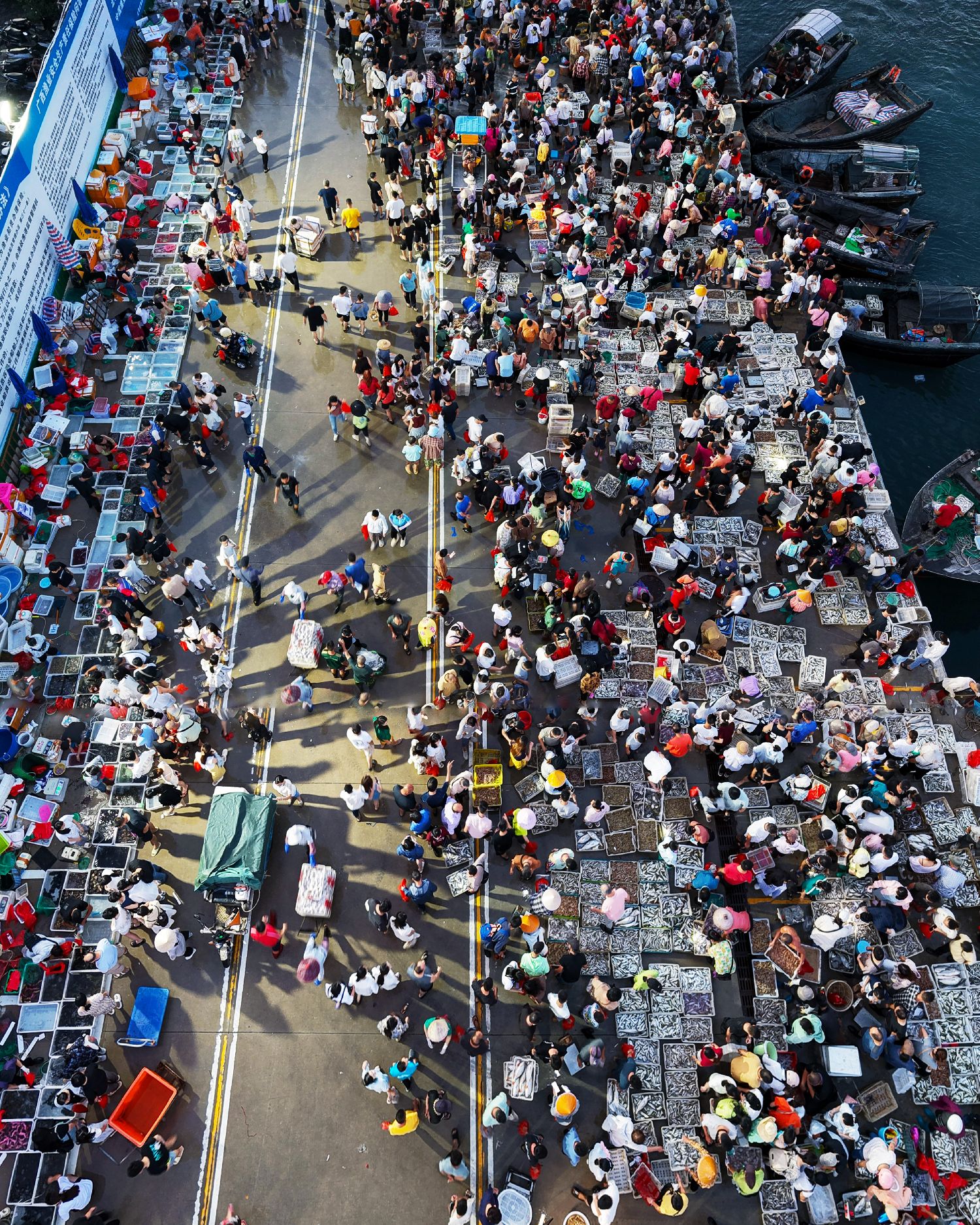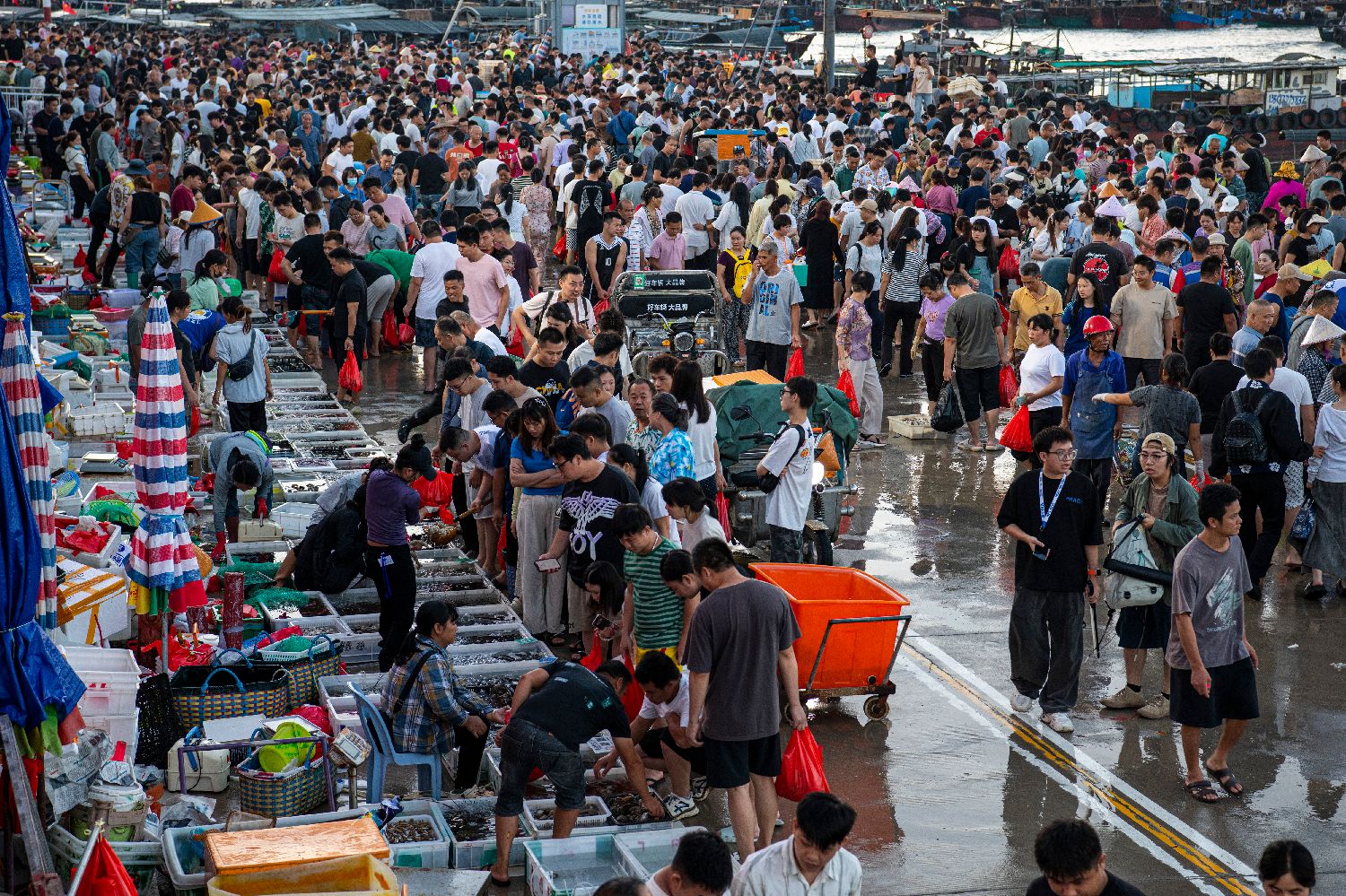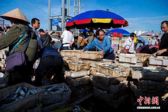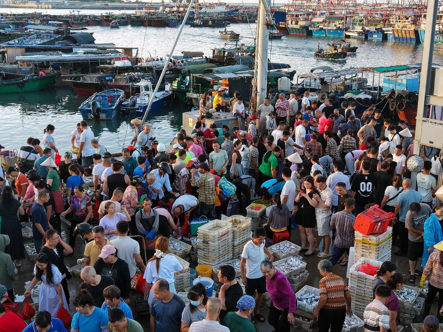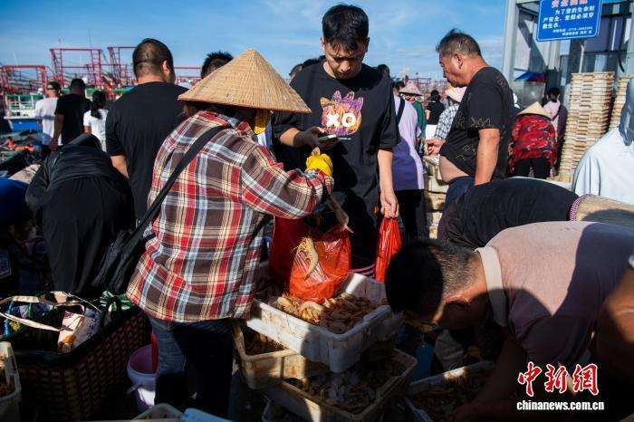 8月17日,南海“开海”第二日,大量海鲜从广西北海侨港镇电建渔港上岸,吸引民众争相采购。侨港镇是中国知名侨乡和广西渔业重镇。中新社
