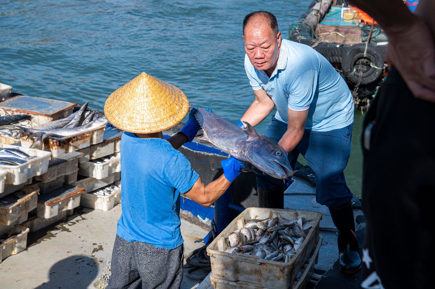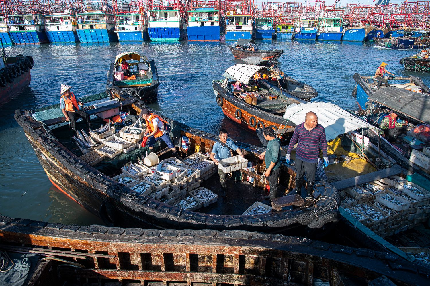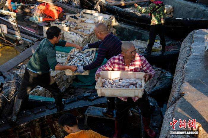 8月17日,工人在电建渔港搬运海鲜上岸。中新网